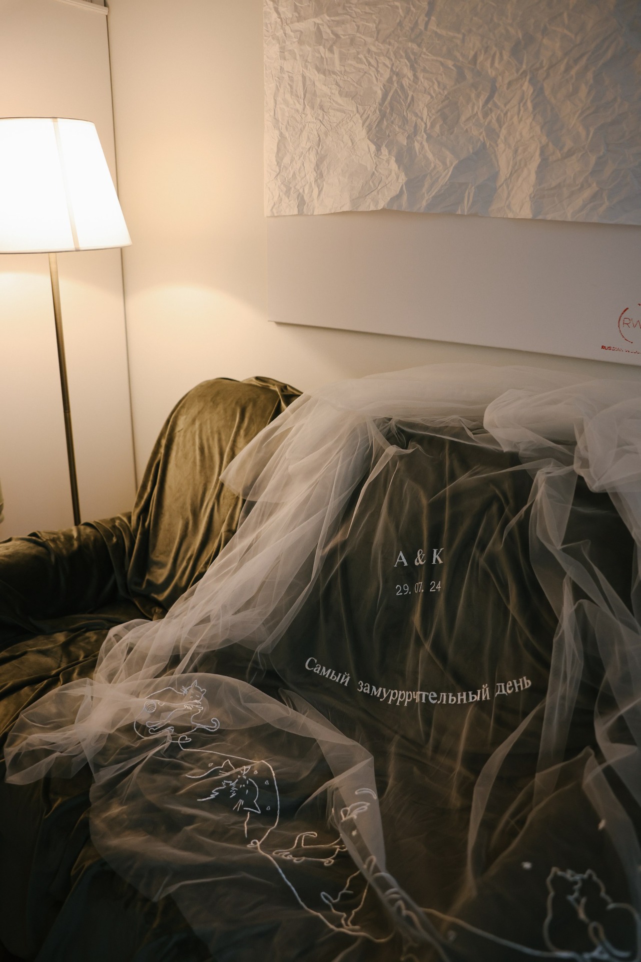К платью мы добавили длинную фату с вышивкой в виде котиков, датой свадьбы и надписью «Самый замурррчательный день». Хоть котов ребят на свадьбе не было, но кошачьи символы были повсюду.