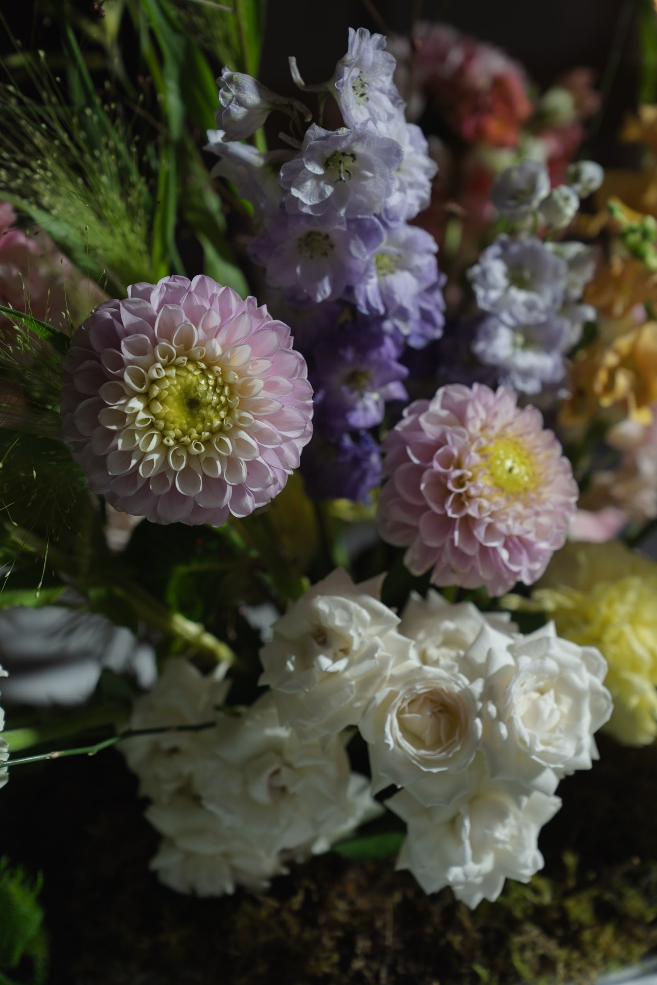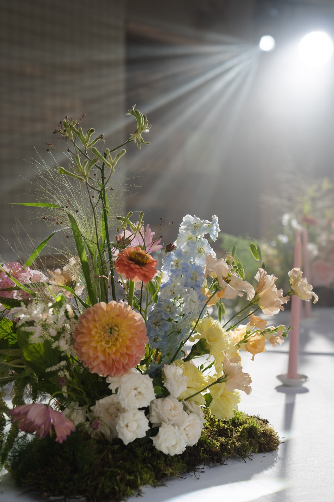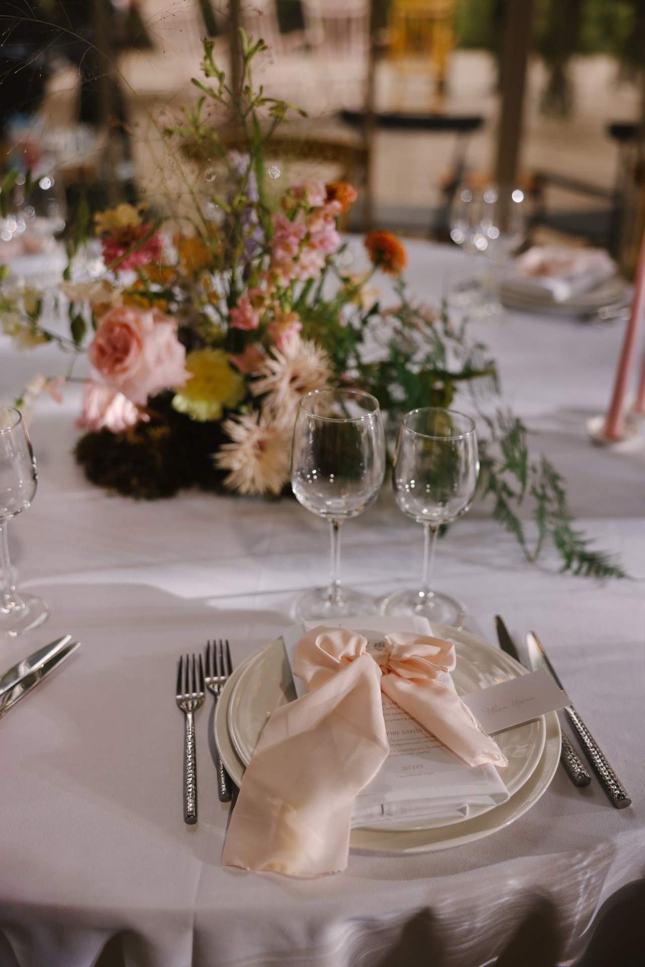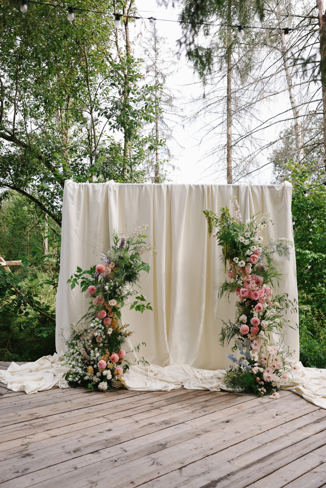 Пересмотрев кучу референсов, мы остановились на садово-лесной эстетике, которая идеально вписалась в антураж площадки The Birch. Добавили ткани, банты, светлый текстиль и нежную садовую флористику в пастельных оттенках. Хотелось поиграть с пространством, поэтому мы решили делать рассадку единым длинным столом из круглых, чтобы заполнить пространство и создать максимально камерную атмосферу праздника.