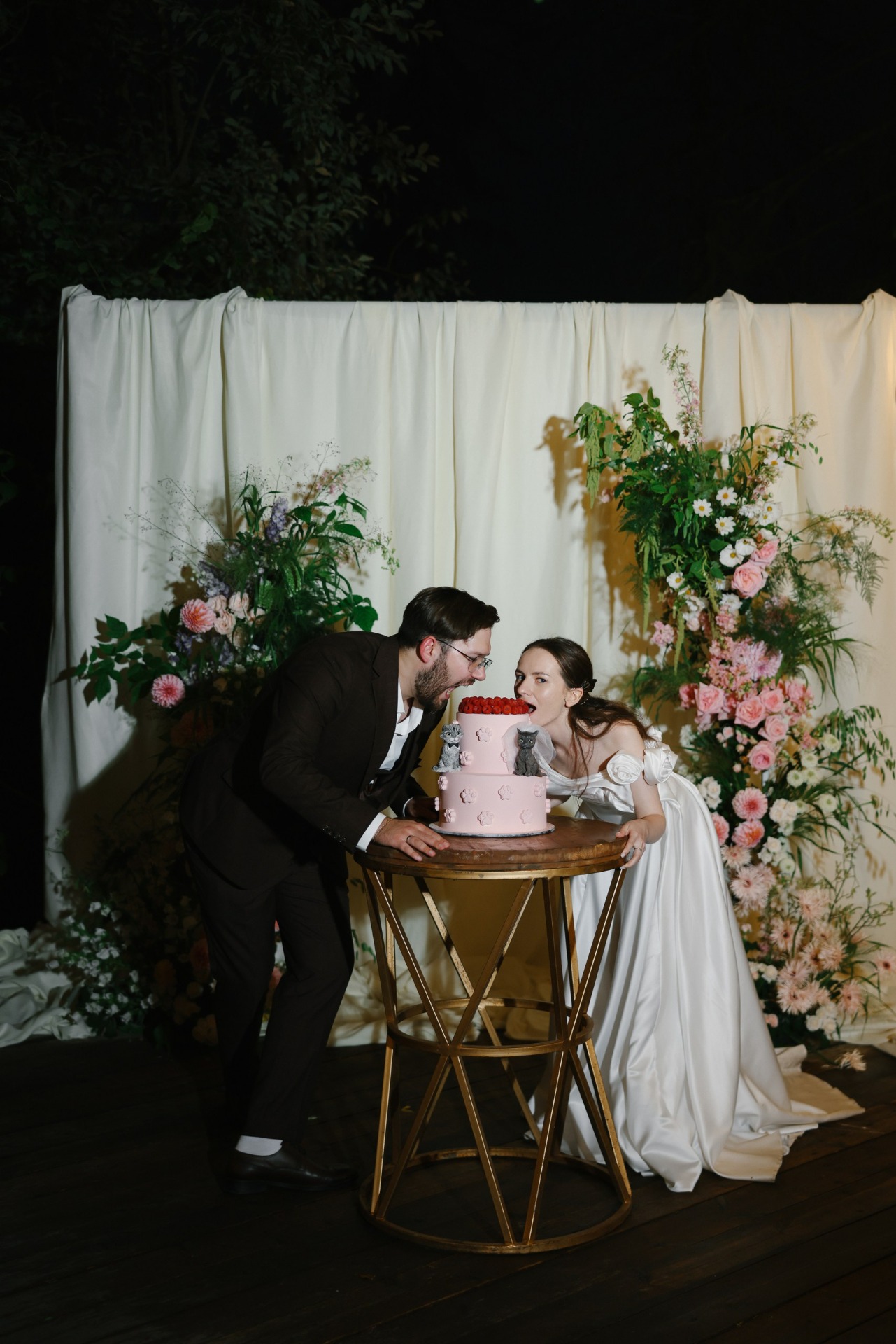 Самым быстрым решением был визуал торт: ребята обожают своих котов, но взять на свадьбу их было нереально, так что они придумали сделать фигурки со своими котами для торта, было супер мило!