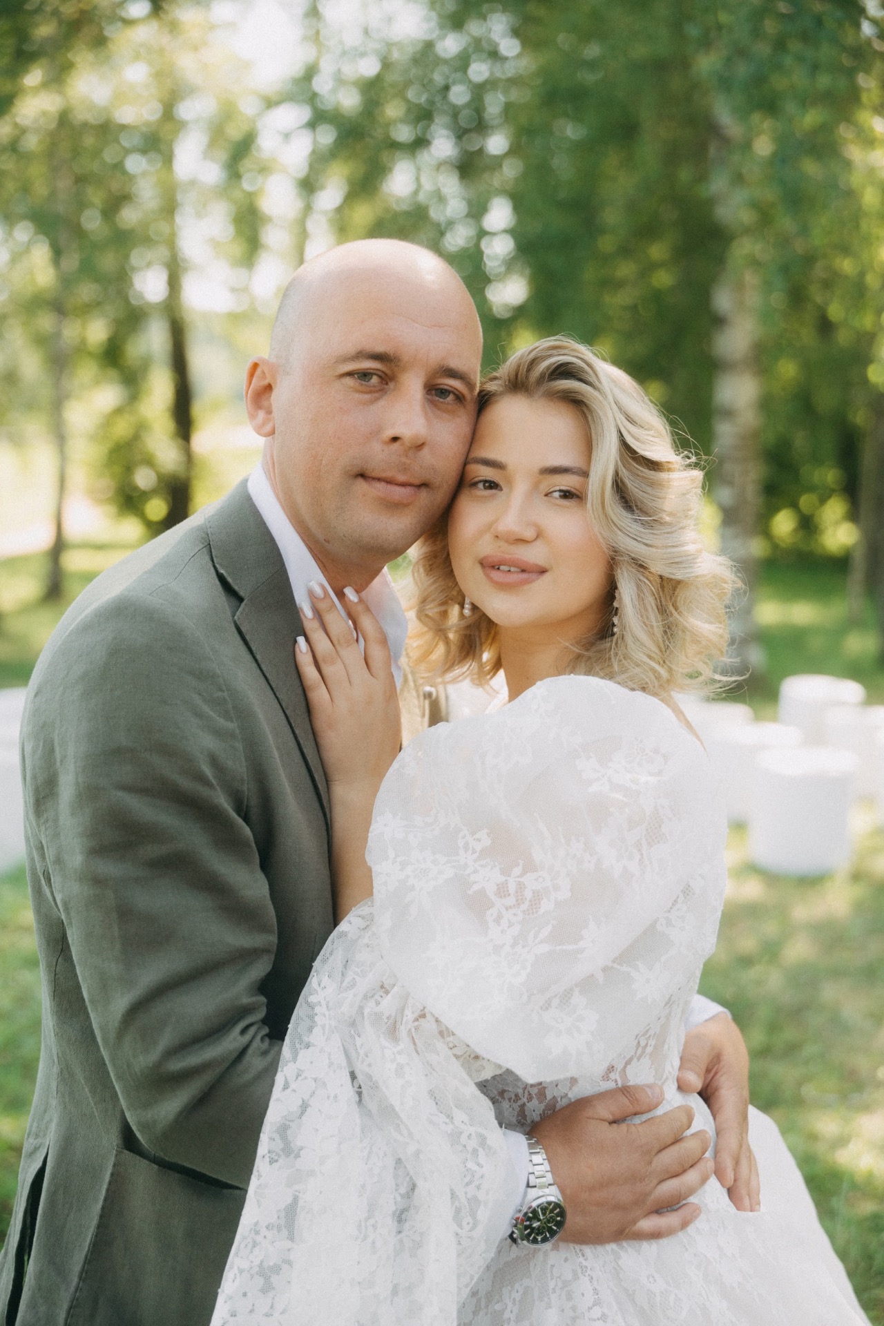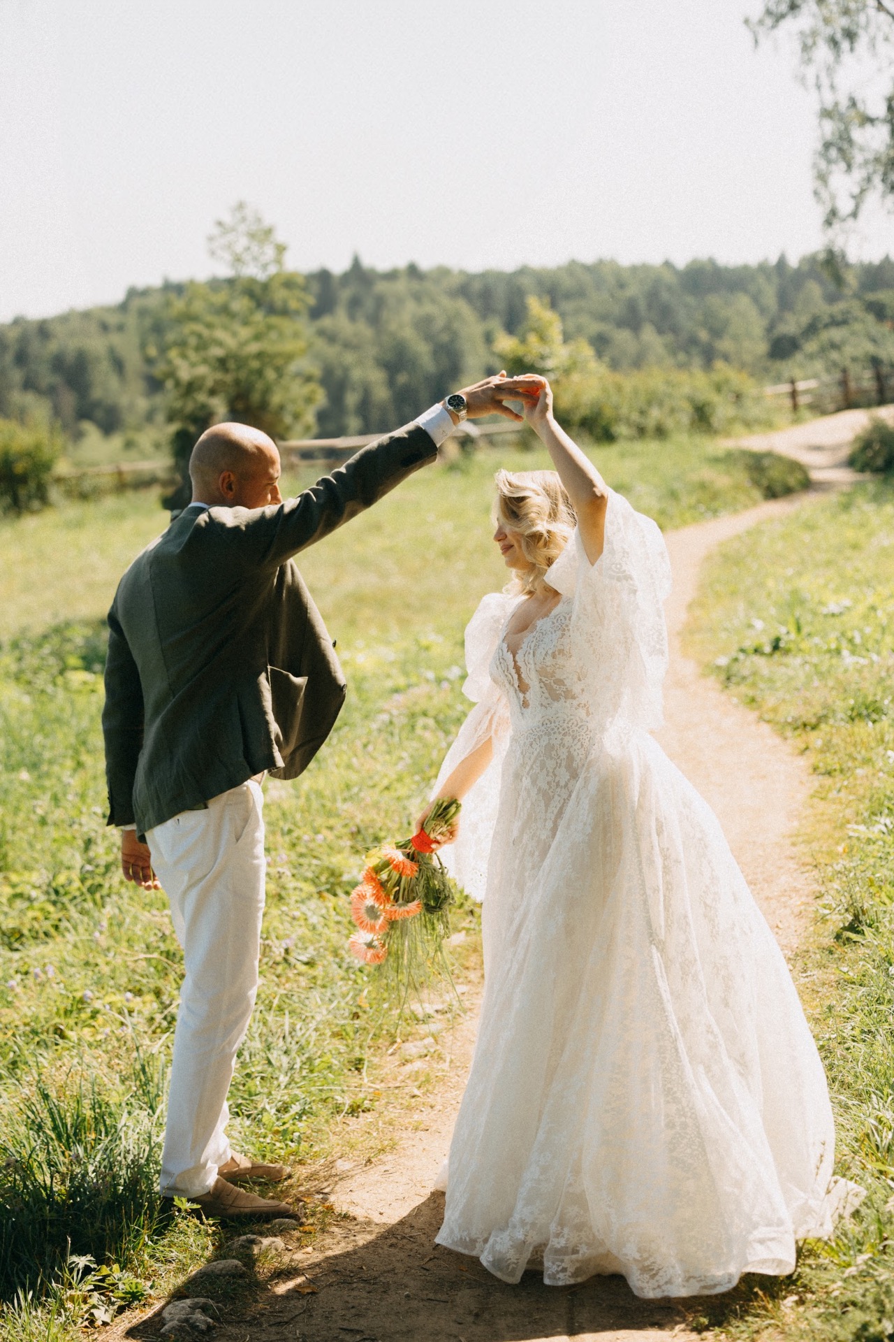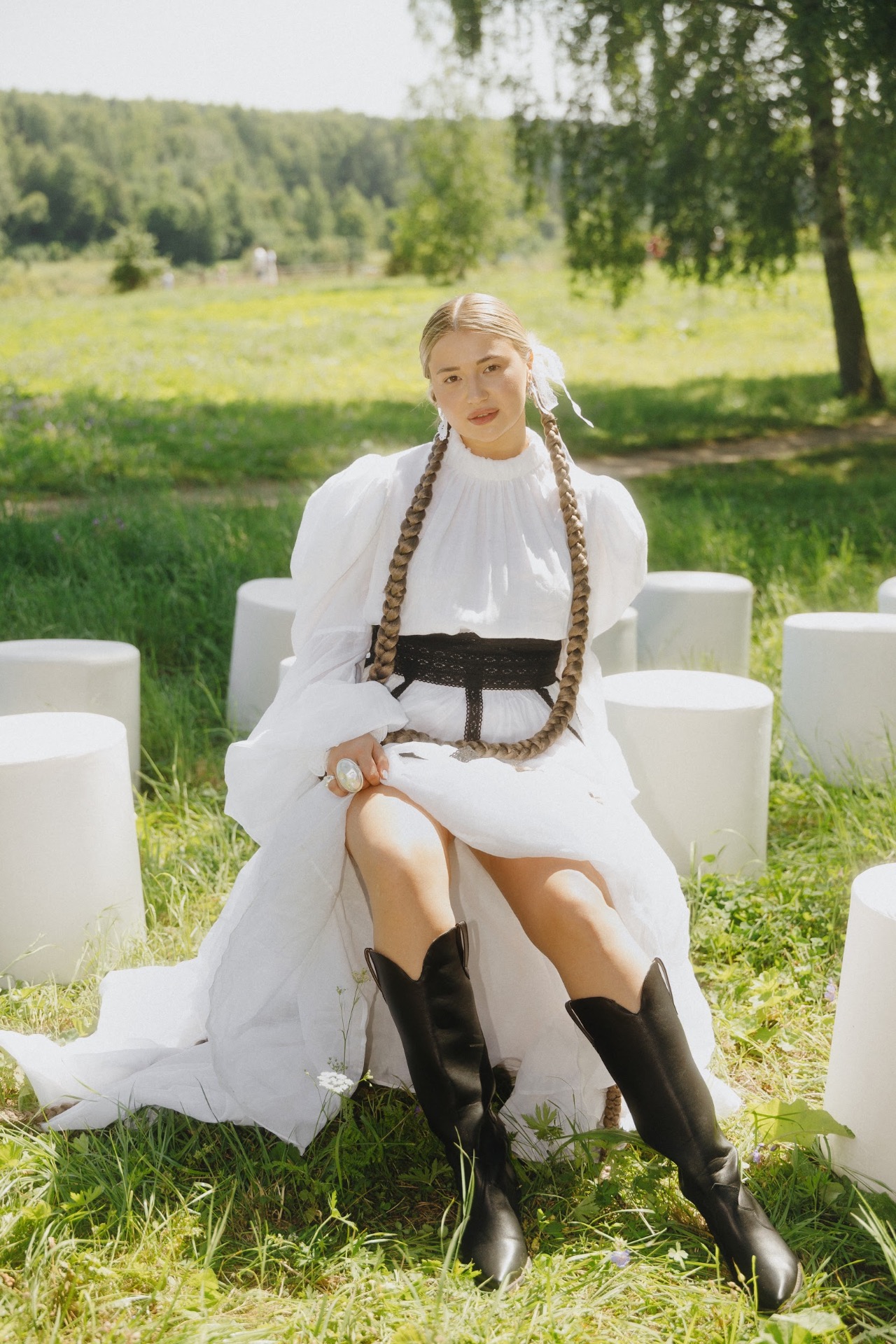 Отдельного внимания заслуживает утренний образ невесты. Стильное платье русского дизайнера Gapanovich Brand из концепт-стора Anti-bride Place стало настоящим украшением Юлии. Образ строился на объёмных формах, лёгкости хлопка и красоте силуэта, подчеркнутой акцентным поясом, который невеста сшила сама.