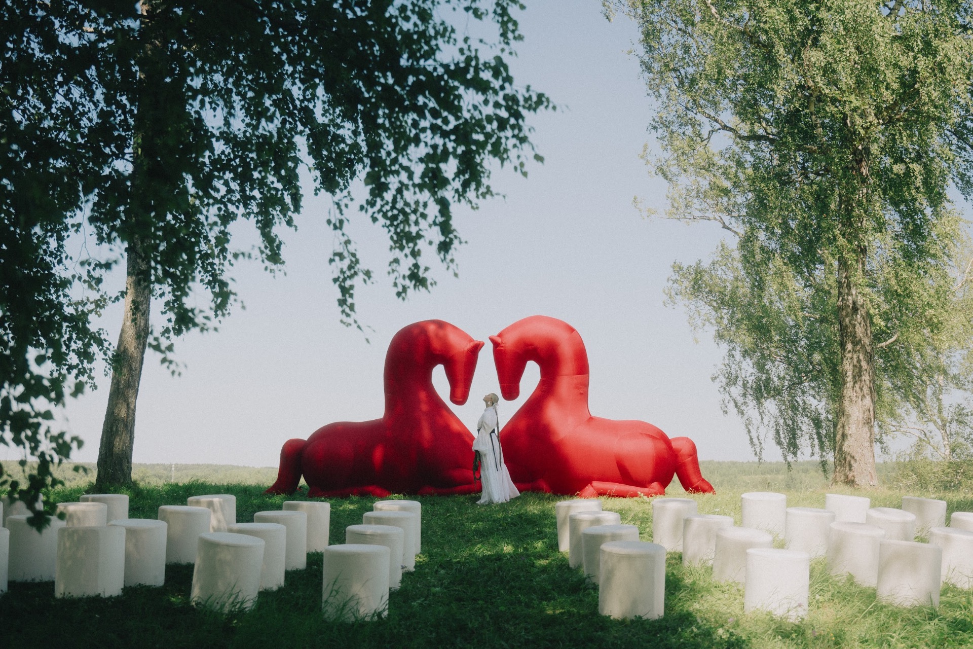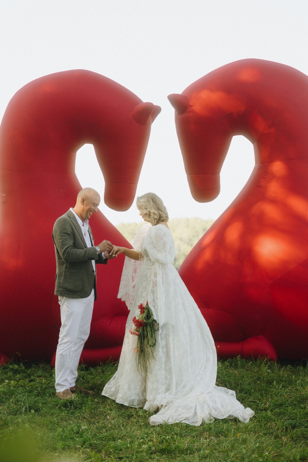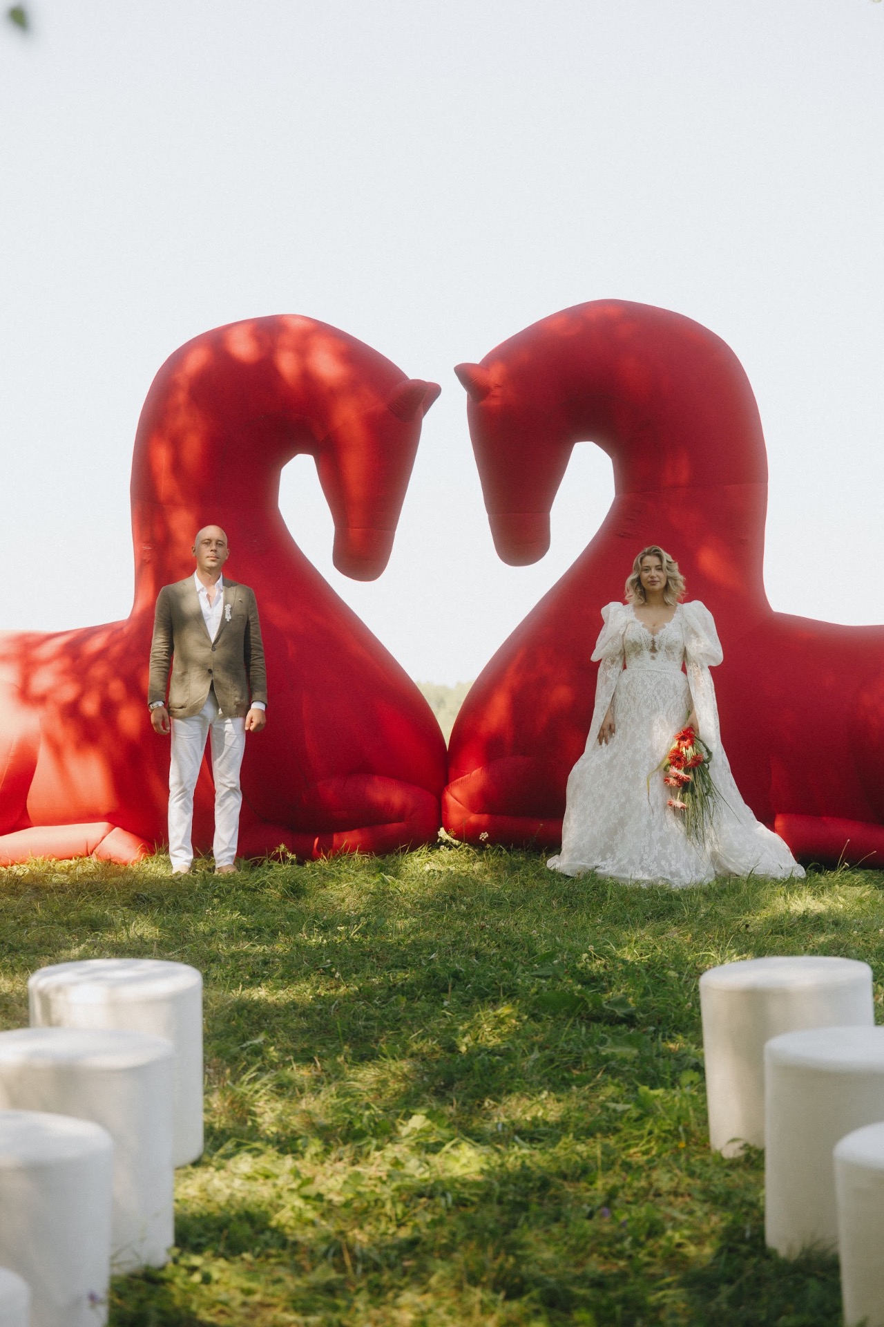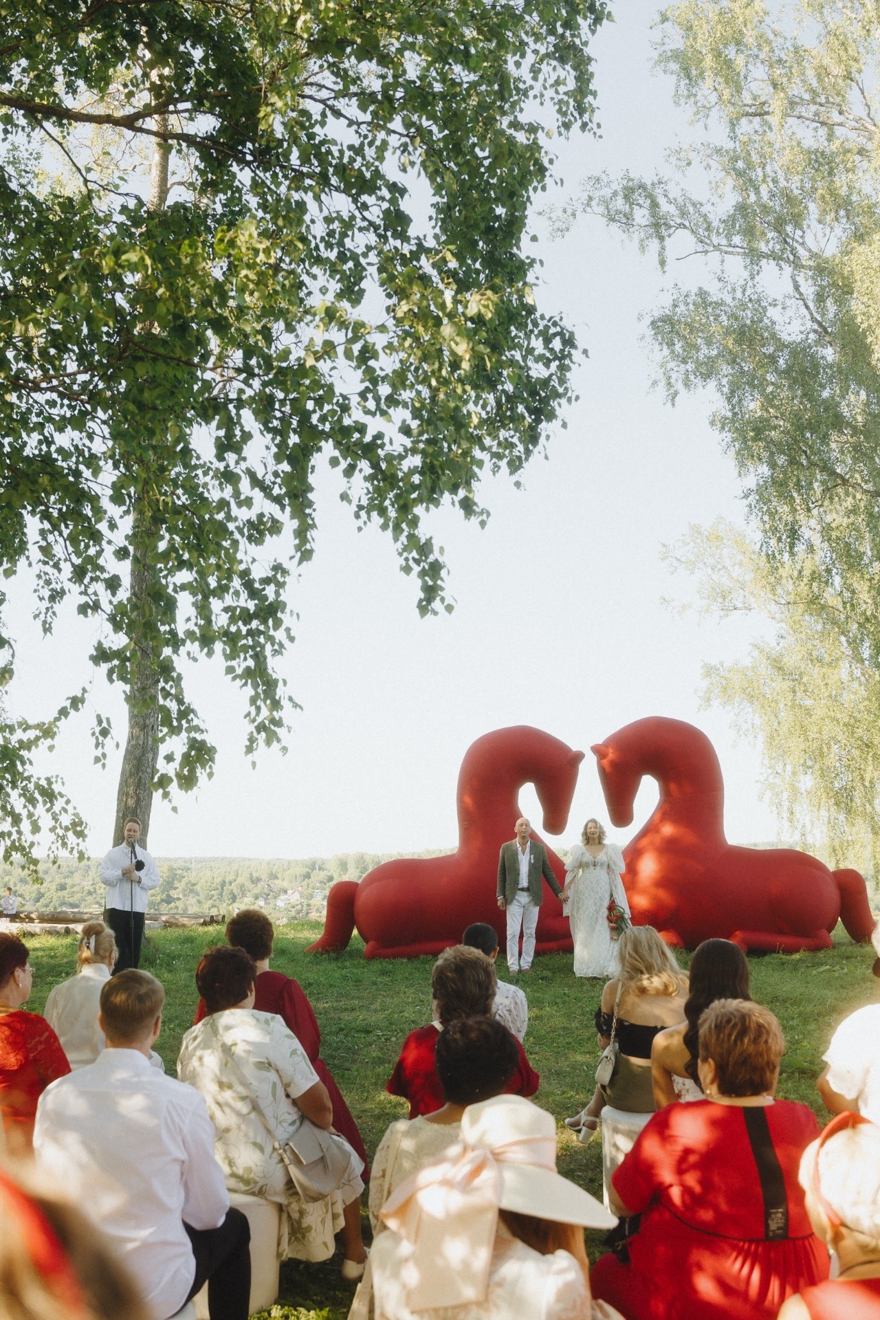 «Жили-были…» — так начинались все русские сказки. Именно с этой фразы стартовала новая история любви и символичного единения. Визуальный код проекта был вдохновлён мезенской росписью, где лошади символизируют семейное счастье и достаток. Именно они стали главным акцентом дня: над церемонией возвышалась восьмиметровая арт-инсталляция в виде двух лошадей, склонивших головы в форме сердца. За ней открывался вид на Волгу — словно взгляд в общее будущее пары, родившейся на этих берегах