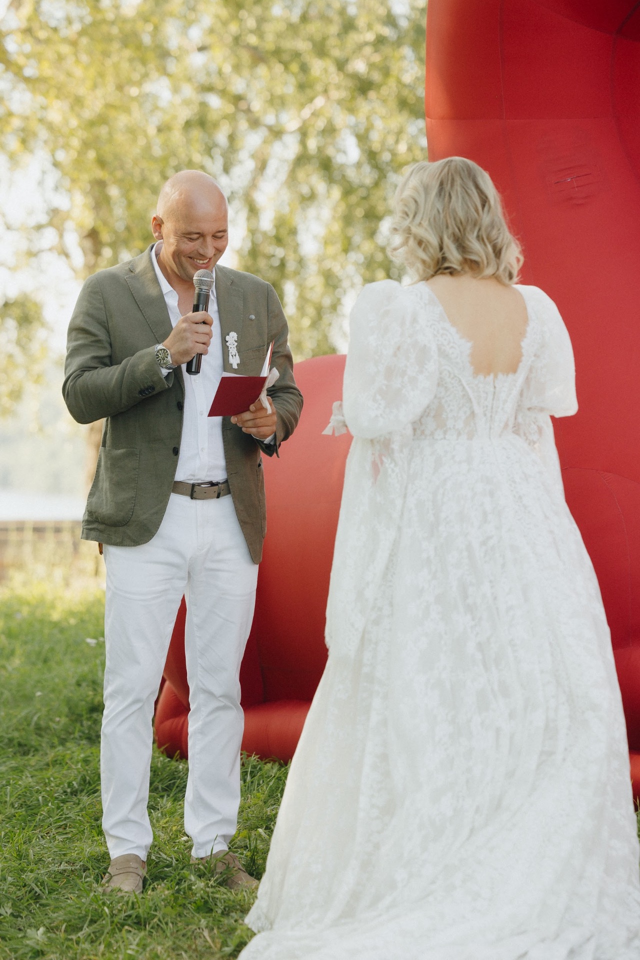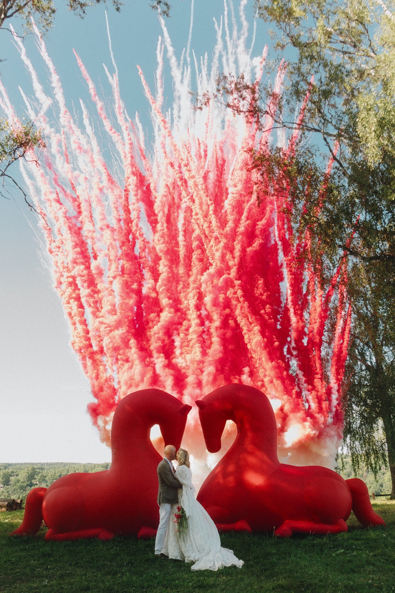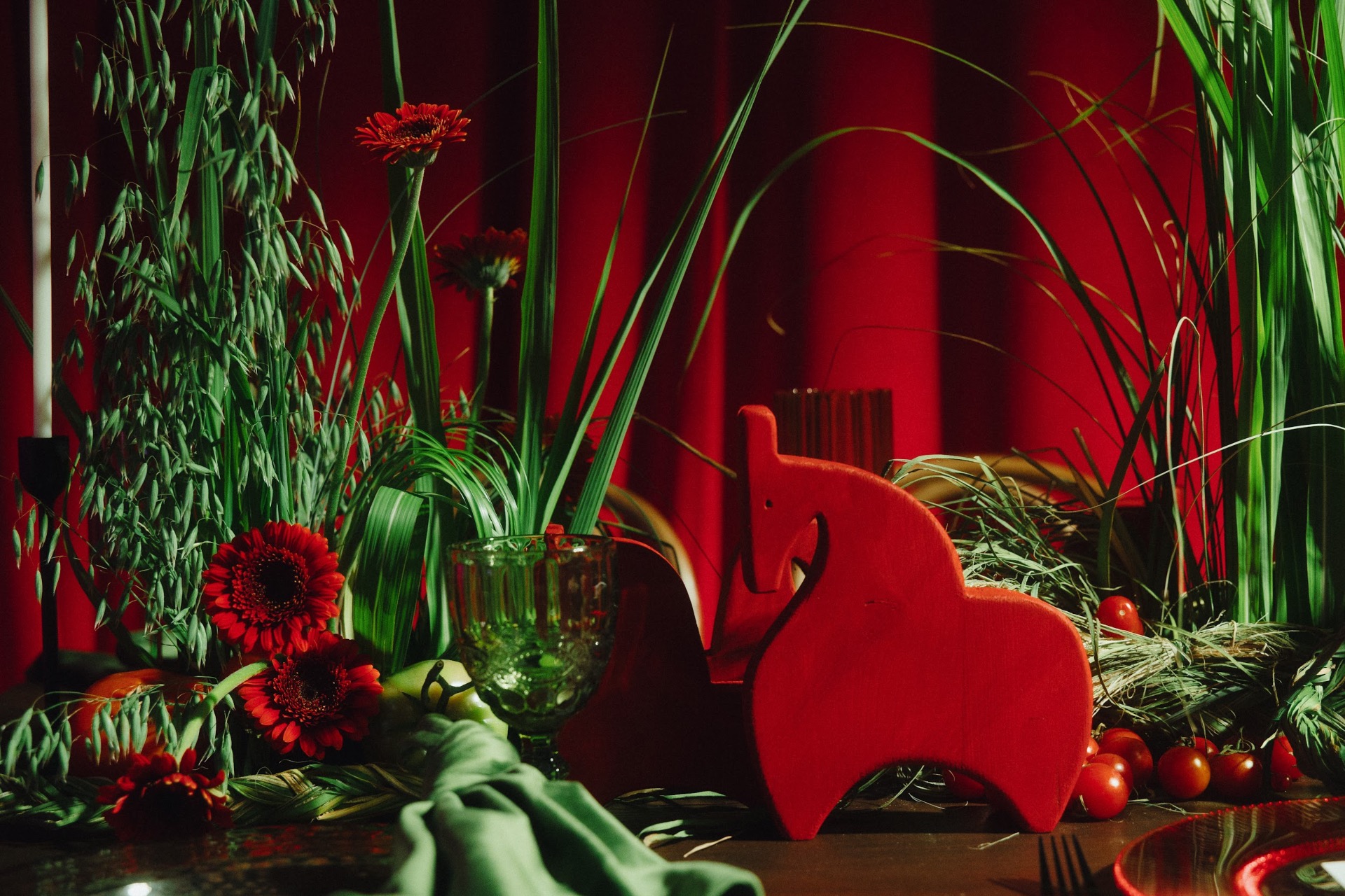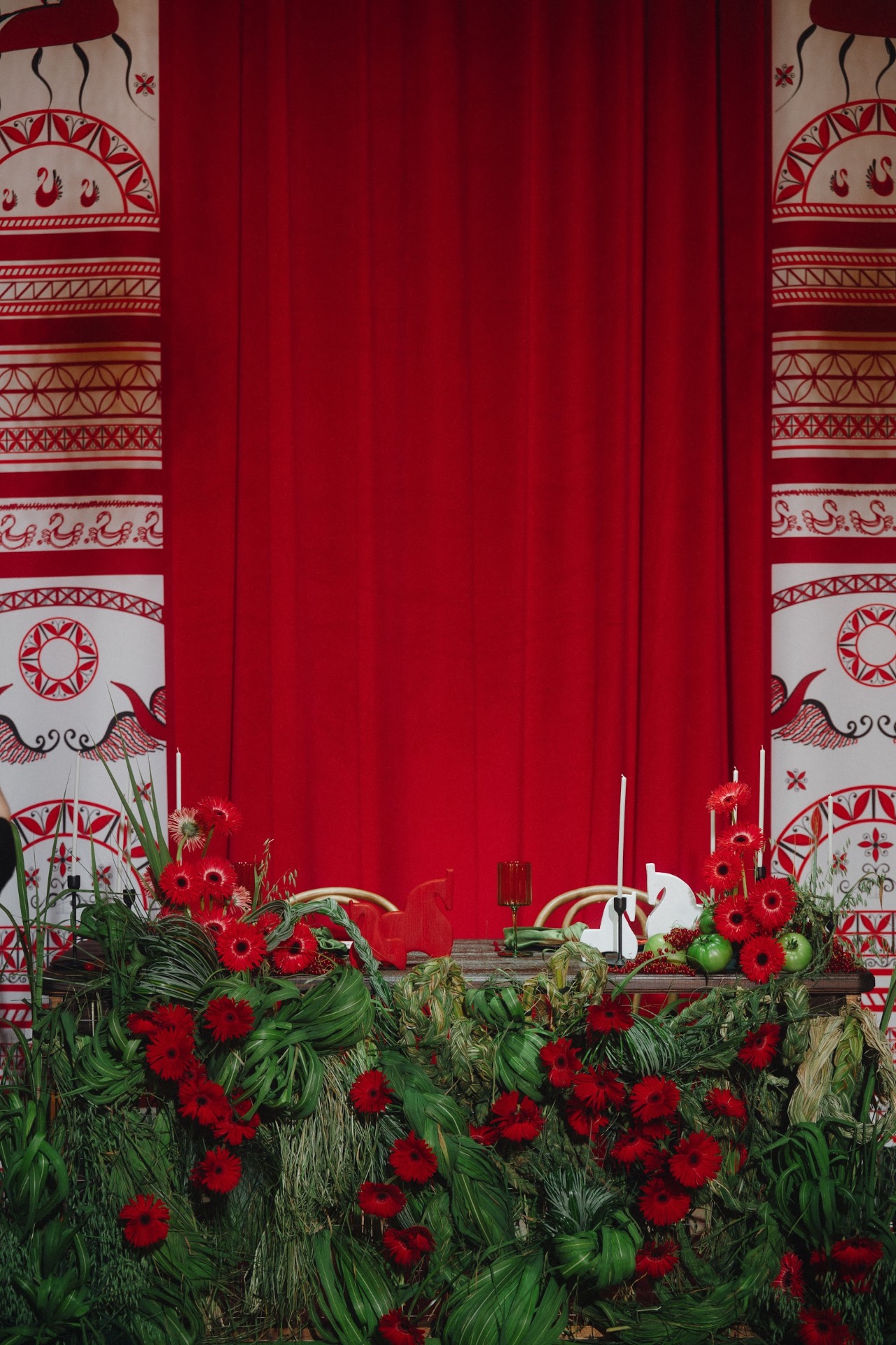 «Жили-были…» — так начинались все русские сказки. Именно с этой фразы стартовала новая история любви и символичного единения. Визуальный код проекта был вдохновлён мезенской росписью, где лошади символизируют семейное счастье и достаток. Именно они стали главным акцентом дня: над церемонией возвышалась восьмиметровая арт-инсталляция в виде двух лошадей, склонивших головы в форме сердца. За ней открывался вид на Волгу — словно взгляд в общее будущее пары, родившейся на этих берегах