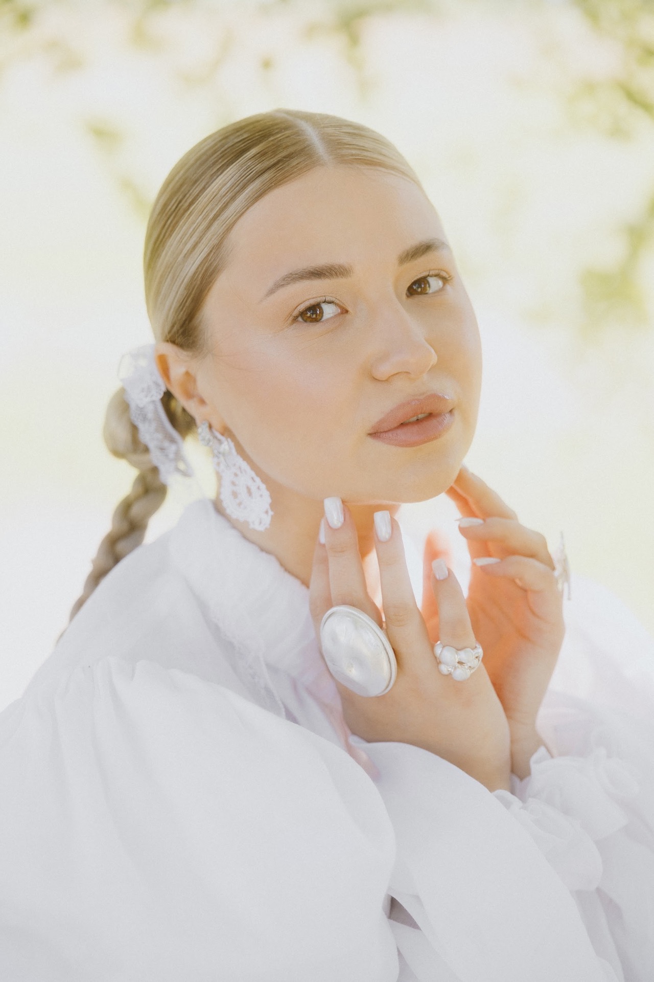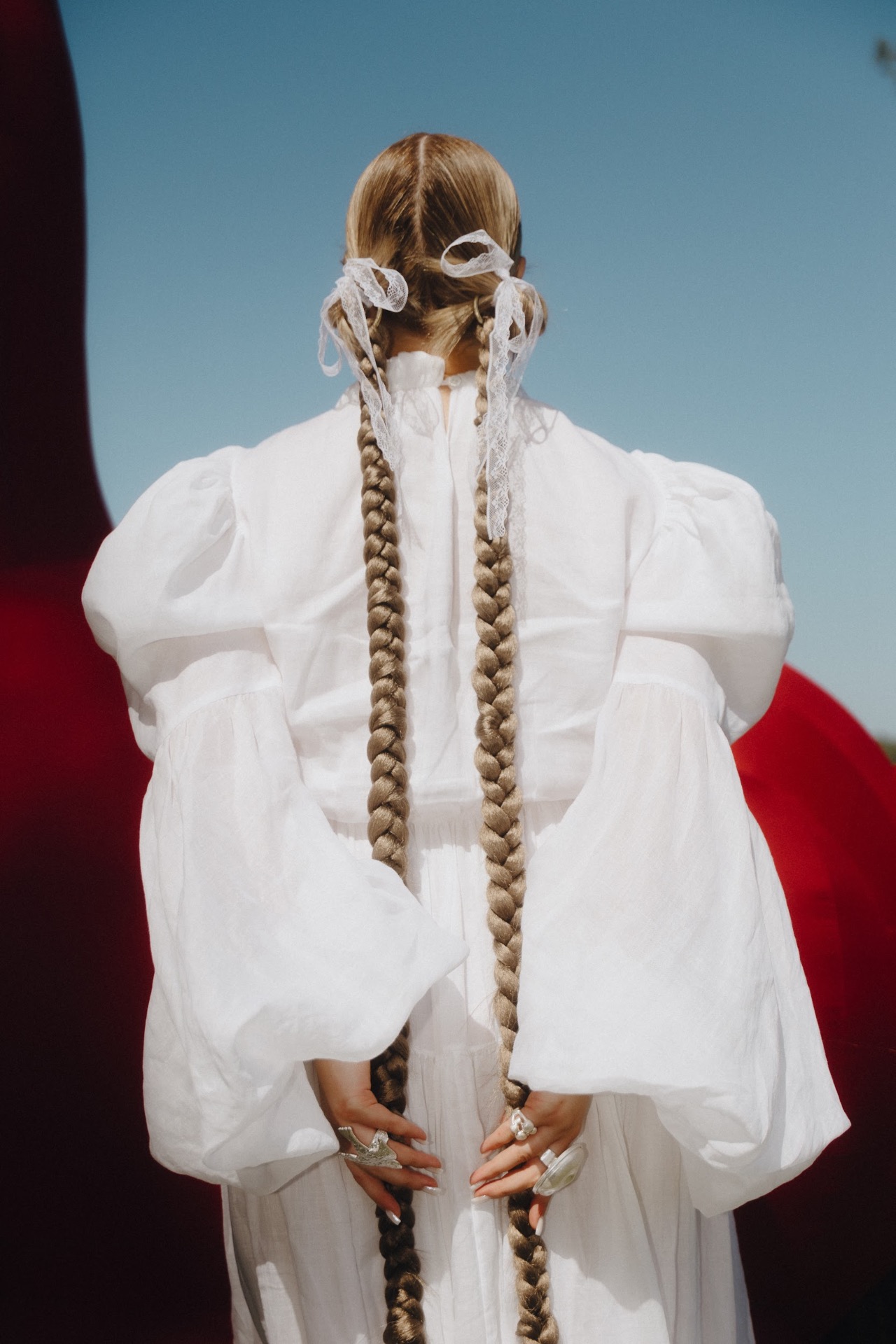 Стилист Ольга Гаврилина дополнила look трёхметровыми косами, нежным нюдовым макияжем и акцентными украшениями, которые придали образу Юлии ещё больше яркости.