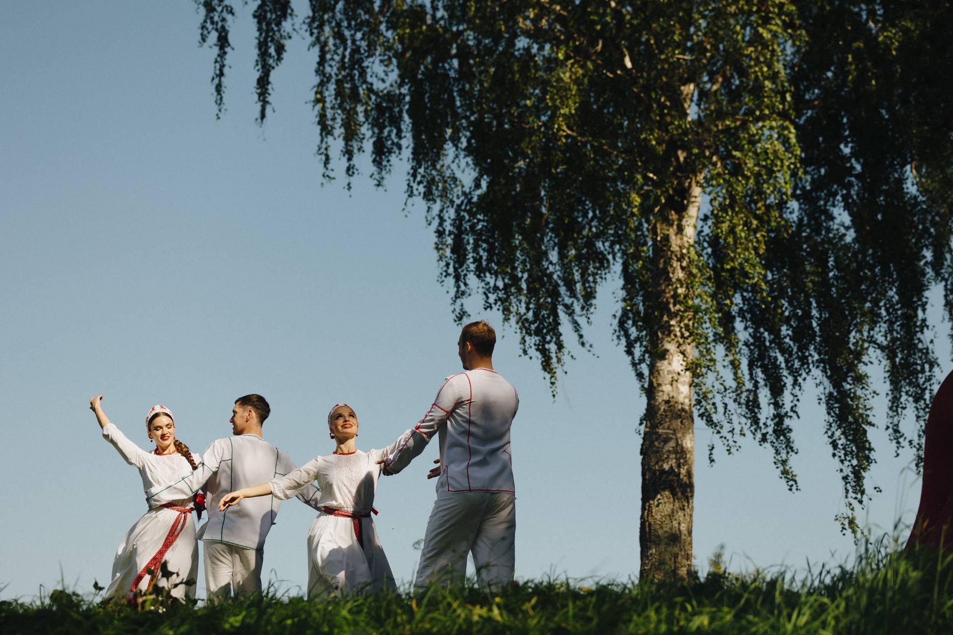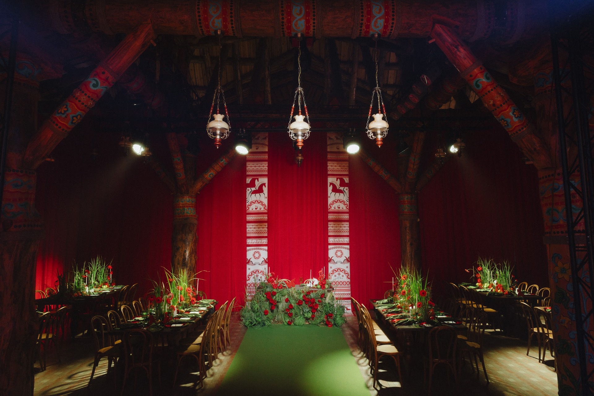 Мы предложили паре уникальную концепцию «Жили-были». Главной задачей проекта был уход от стереотипных представлений о визуальном коде «а-ля рус». Ведь первое, что приходит на ум — обилие сена, колосьев, яблок, леденцов-петушков, орнаментов в стиле «хохломы» или «гжели». Всё это мы отмели сразу! Нам хотелось показать, что «а-ля рус» — это не только про сено и колосья. Мы посмотрели на него под другим углом.