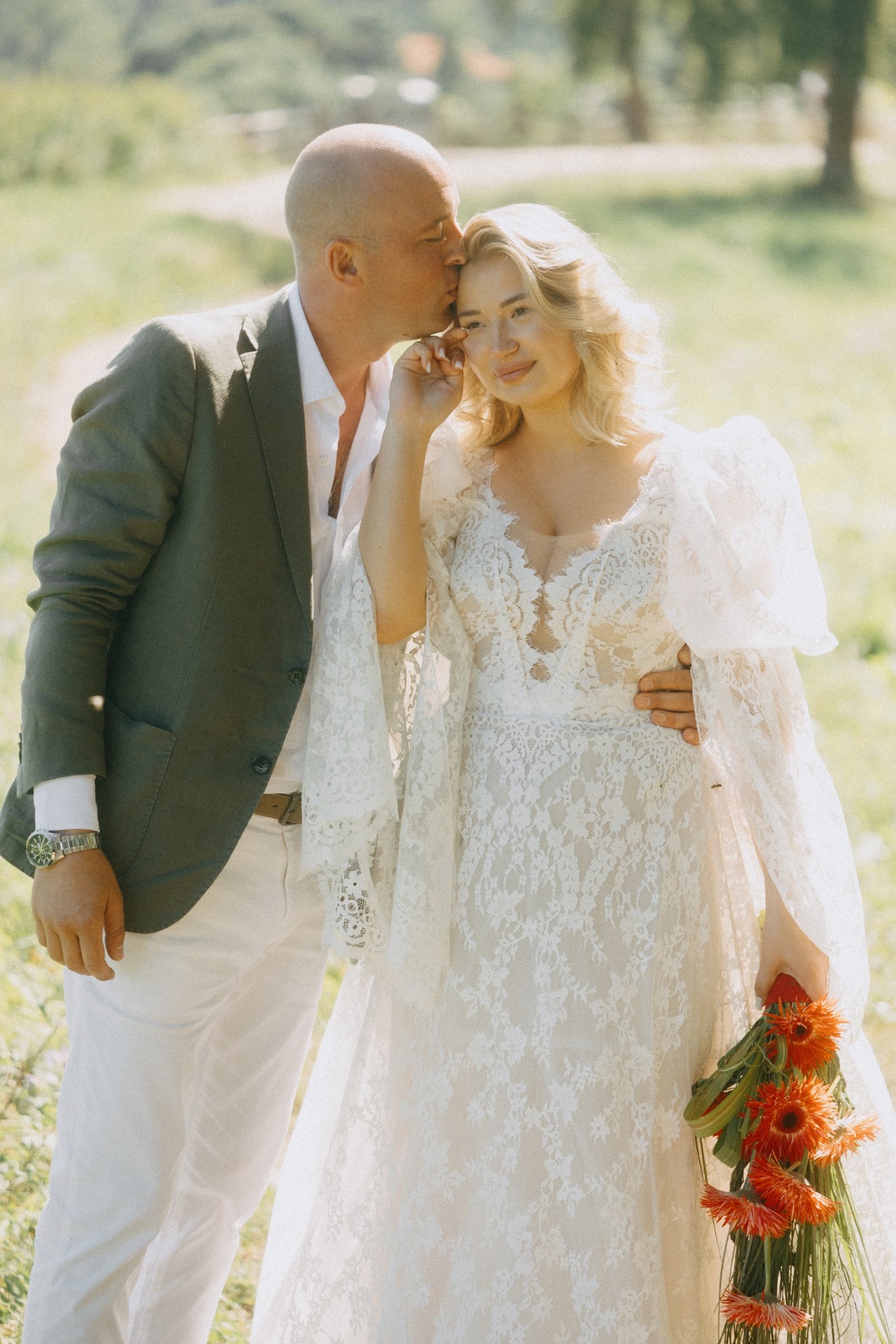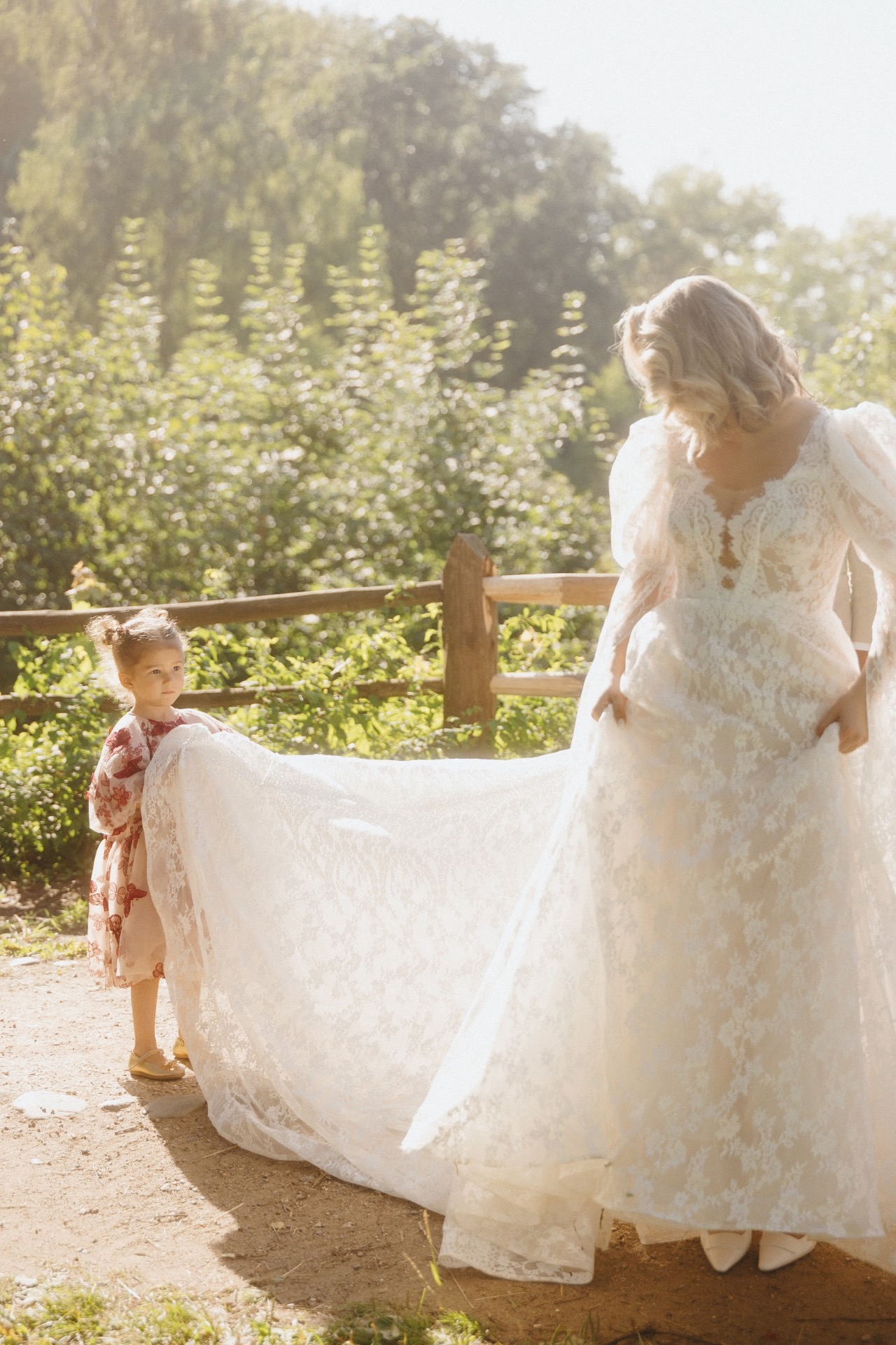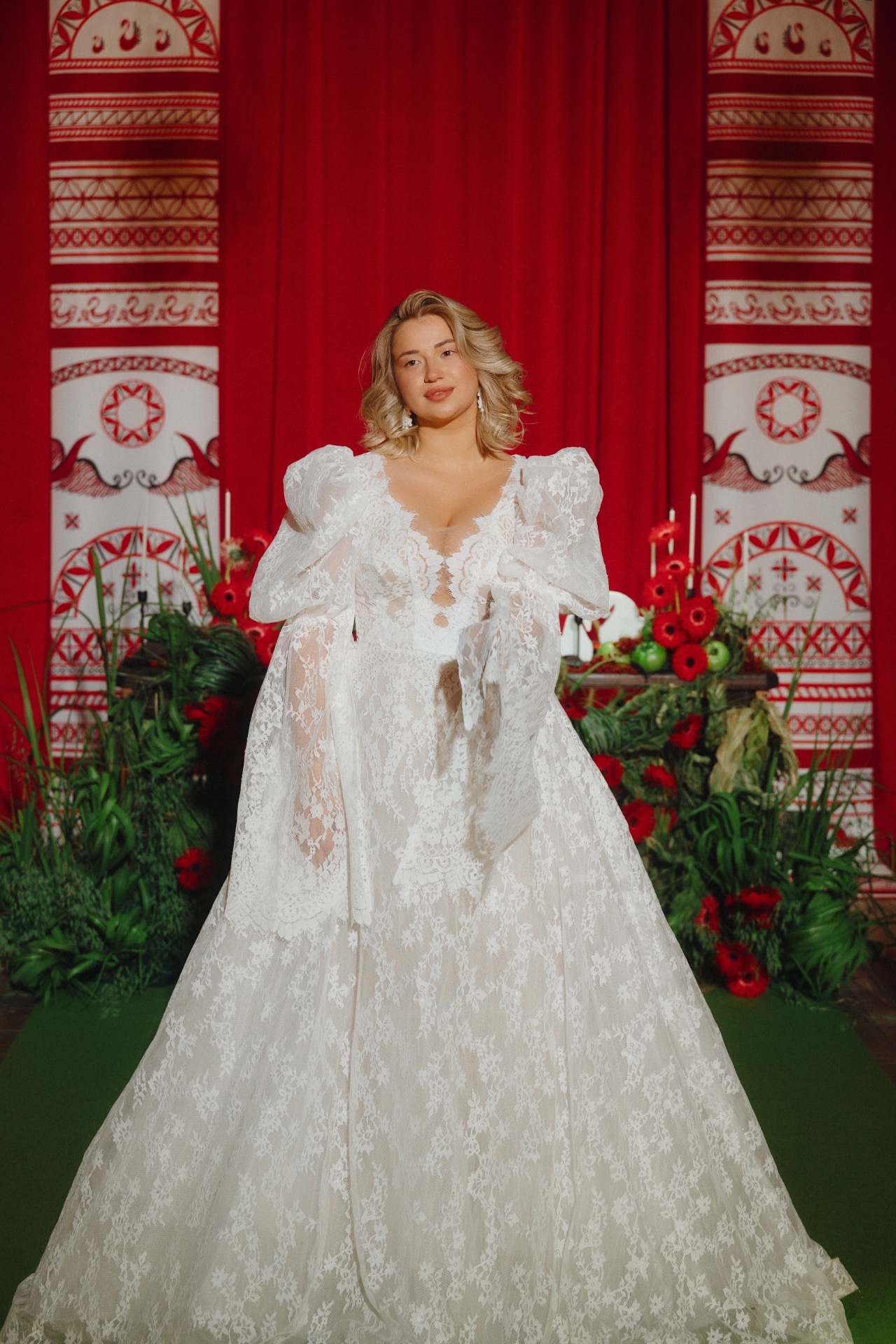 Основное платье из салона Kuraje тоже было непростым: мы сделали апгрейд готовой модели за счёт объёмных рукавов. В результате получилась своя, уникальная версия, идеально подходящая нашей невесте.