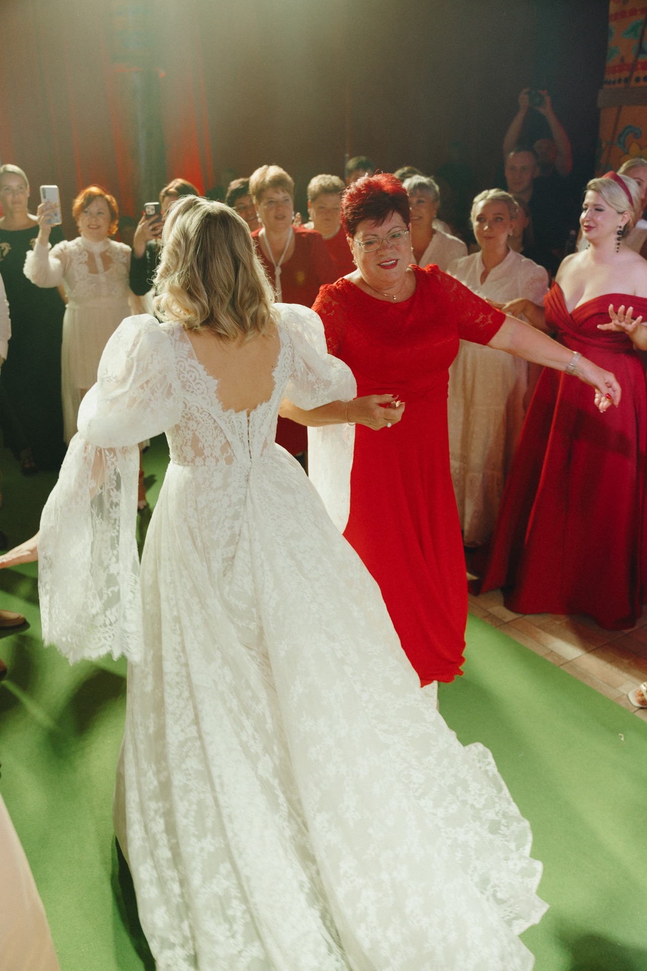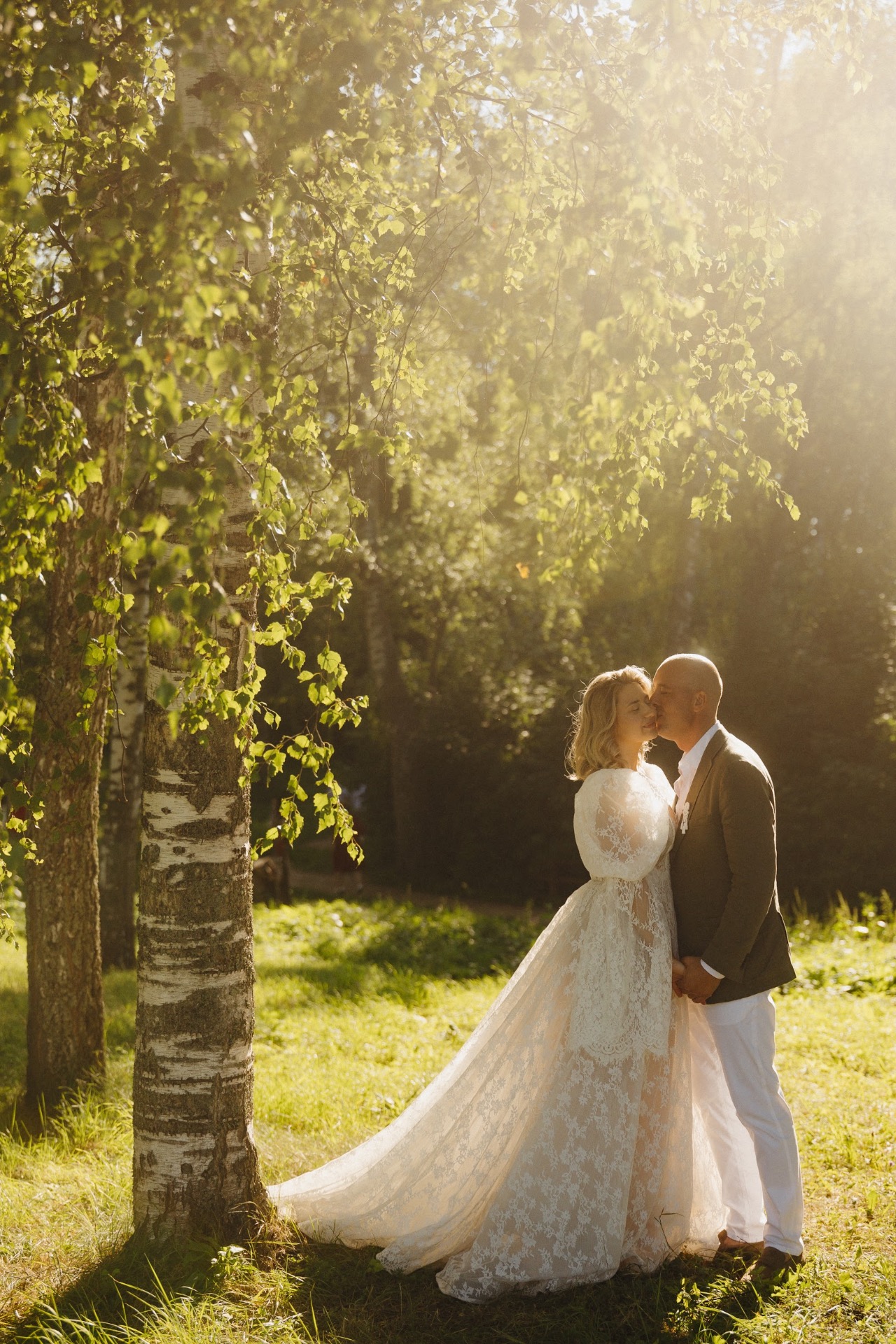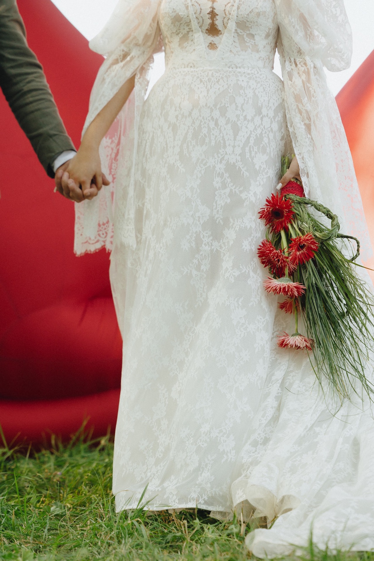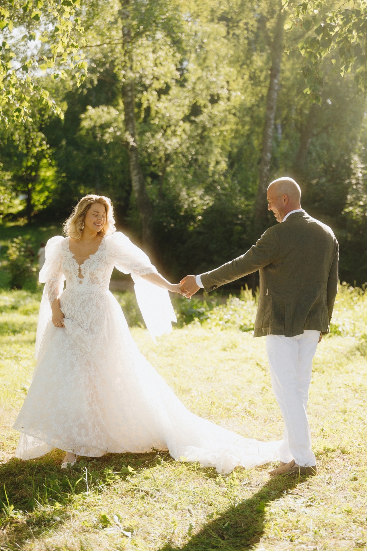 Основное платье из салона Kuraje тоже было непростым: мы сделали апгрейд готовой модели за счёт объёмных рукавов. В результате получилась своя, уникальная версия, идеально подходящая нашей невесте.