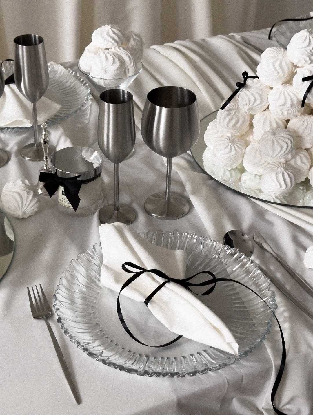 Серебряная, перламутровая или нежно белая палитра отлично подойдут для зимней свадьбы: немного блеска, мерцания и белоснежный пейзаж за окном создадут по-настоящему завораживающую атмосферу.