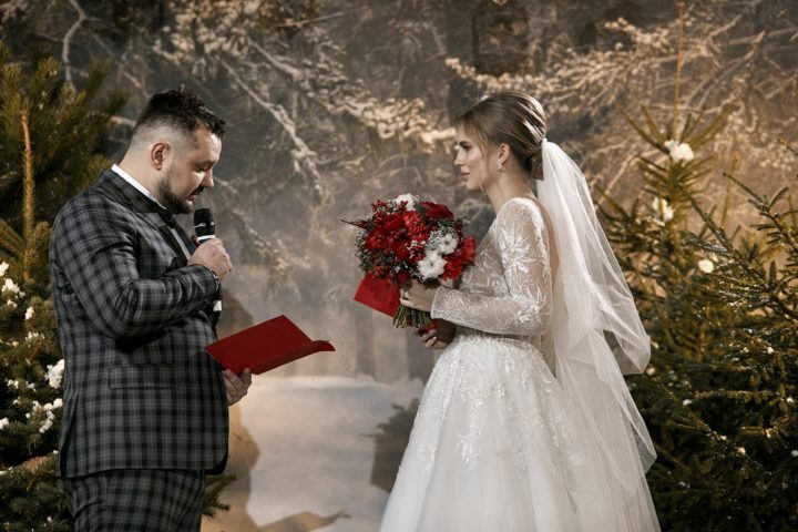 В концепции свадьбы мы хотели совместить атмосферу зимней сказки и русскую масленицу, так как свадьба была в феврале. Очень хотелось теплого и уютного семейного праздника. Пригласительные были сделаны в виде льдинок с печатью на органическом стекле. Декораторы создали в зале атмосферу «Боярской зимы»: фотозона со снежком и настоящим хвойным лесом, текстиль с нанесением русско-народных узоров.