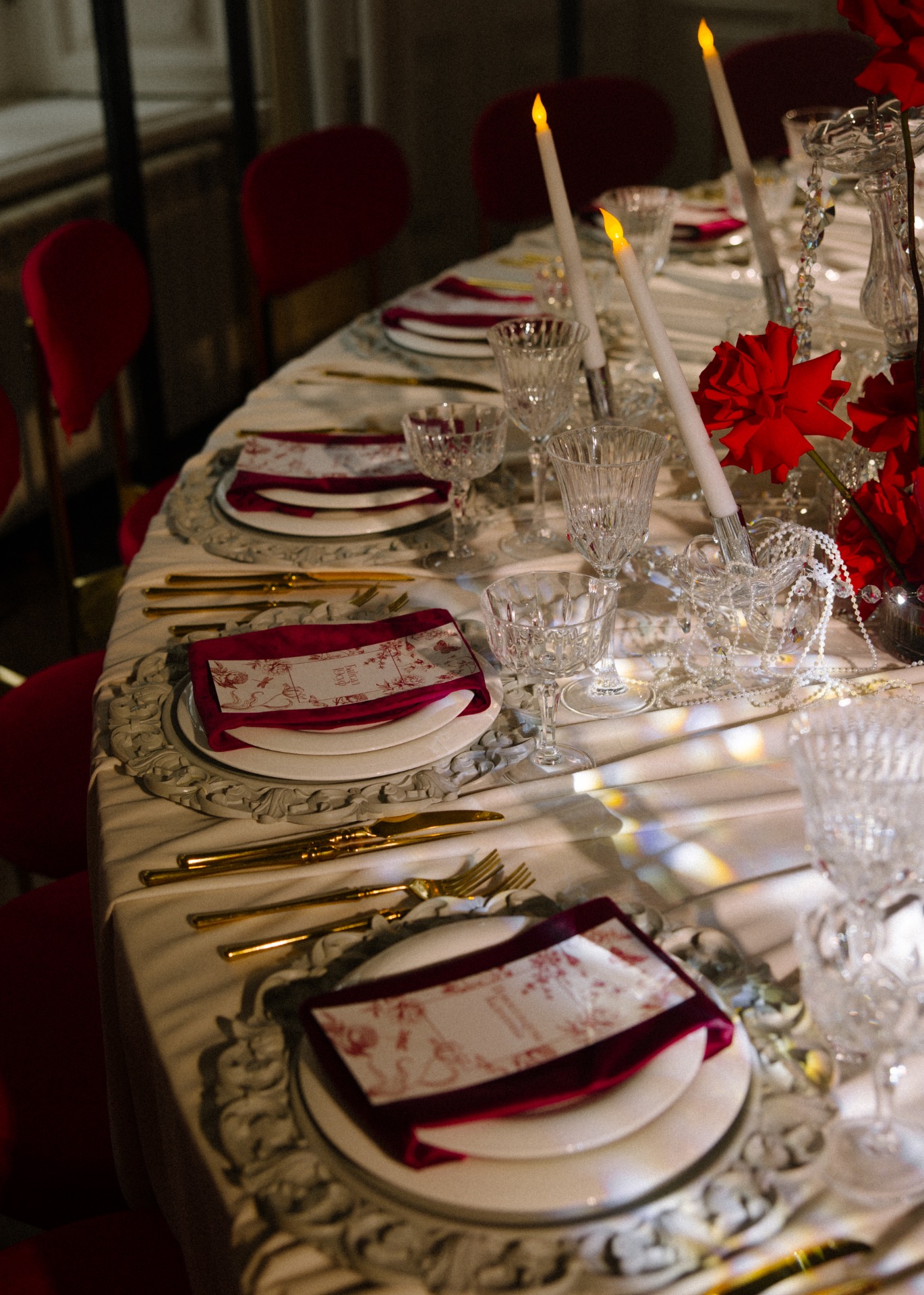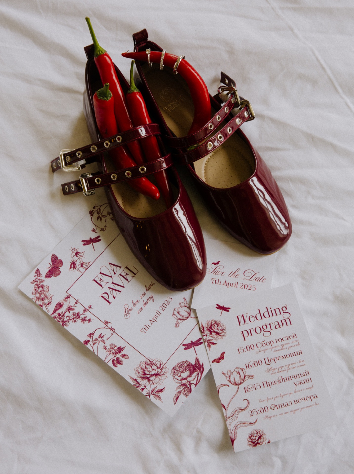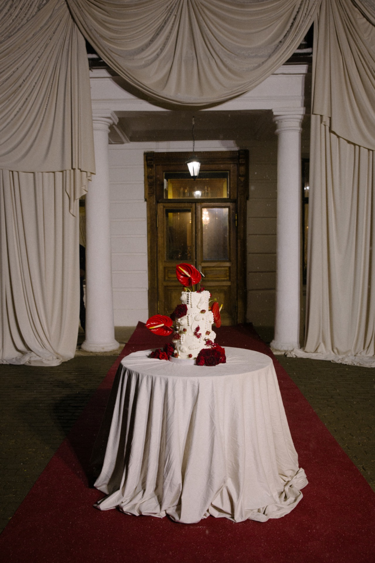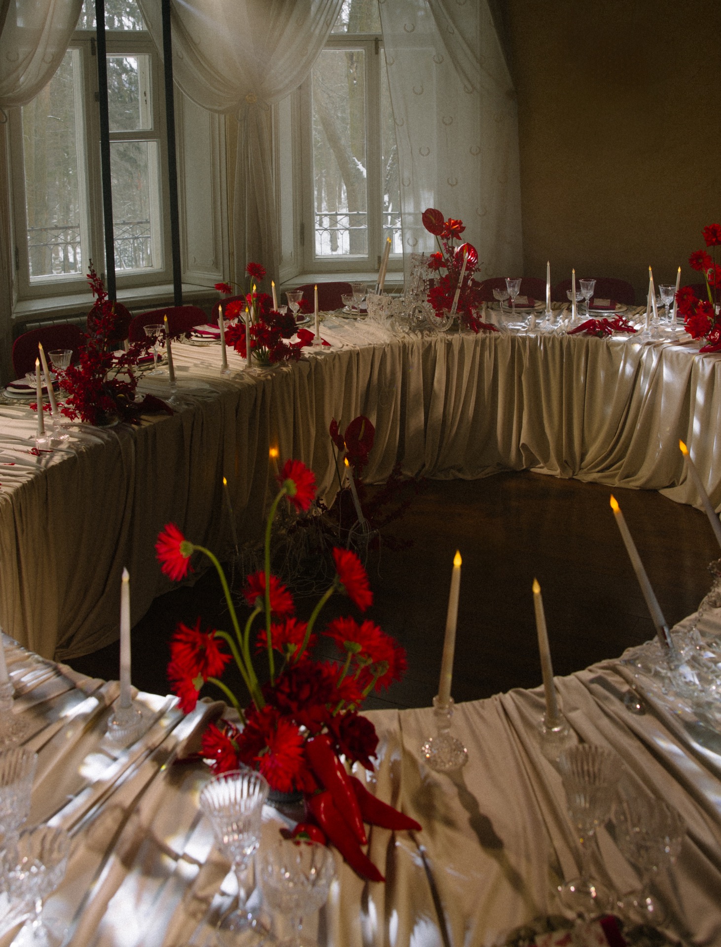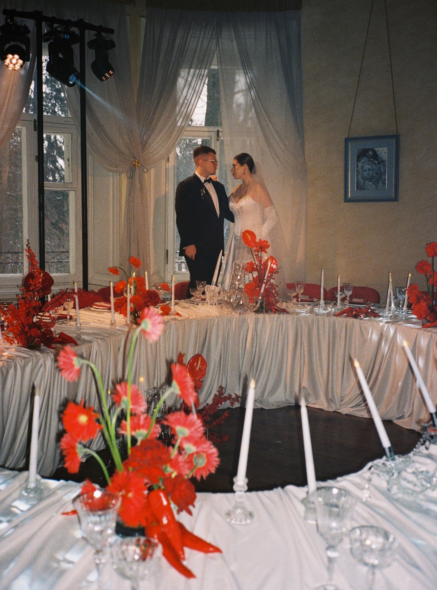 Цвета бордо, золото, красный и белый добавили торжественности и напомнили о классике голливудского кино. Но нам хотелось и креативной изюминки: так появились люстры вместо подсвечников и перцы чили в декоре.