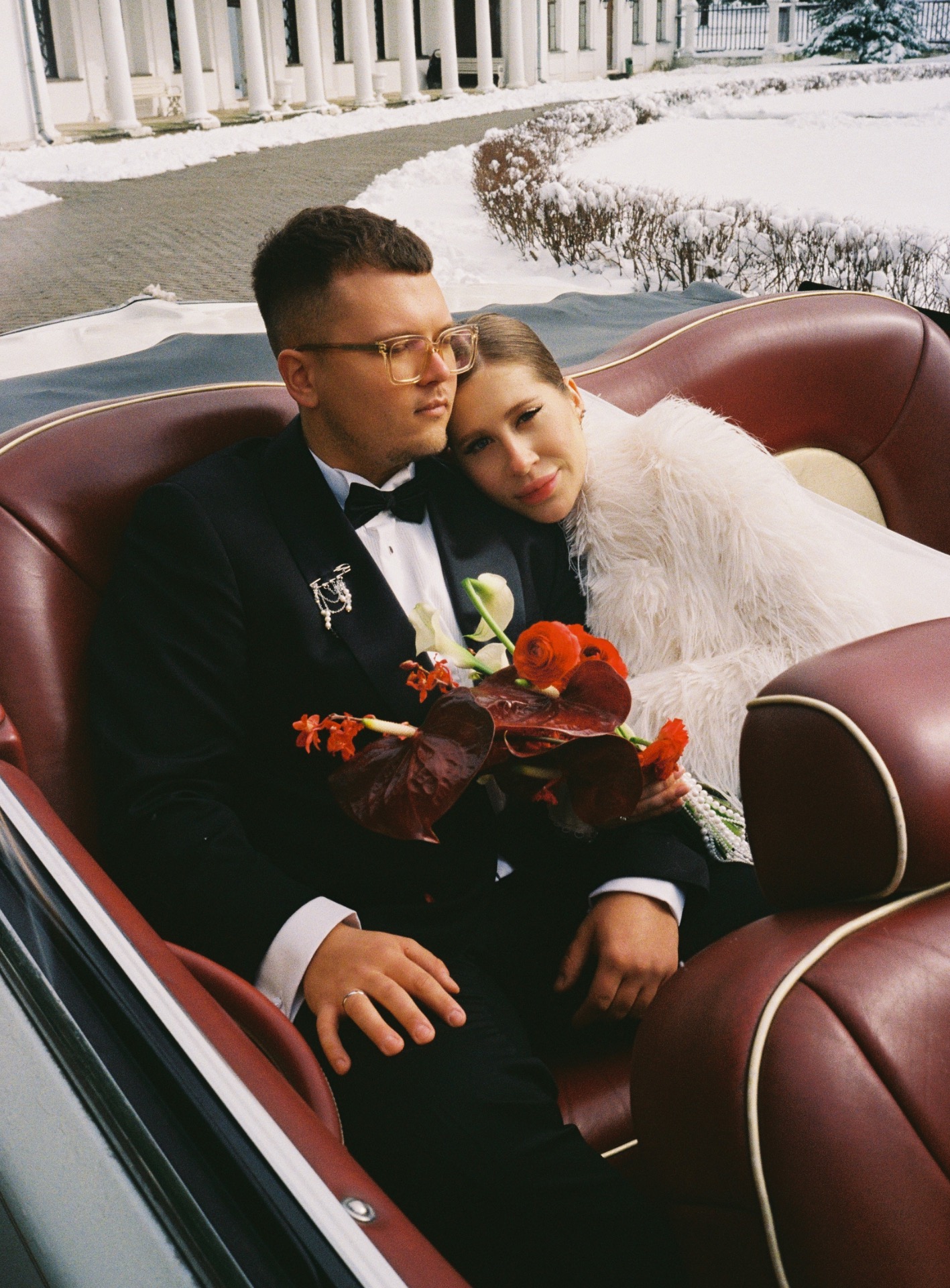 Образ для Паши я продумала уже после того, как нашла своё платье. Он был в классическом чёрном смокинге, с акцентной деталью — брошью с жемчугом на лацкане пиджака. Всё выглядело гармонично и стильно, как будто образы были созданы друг для друга.