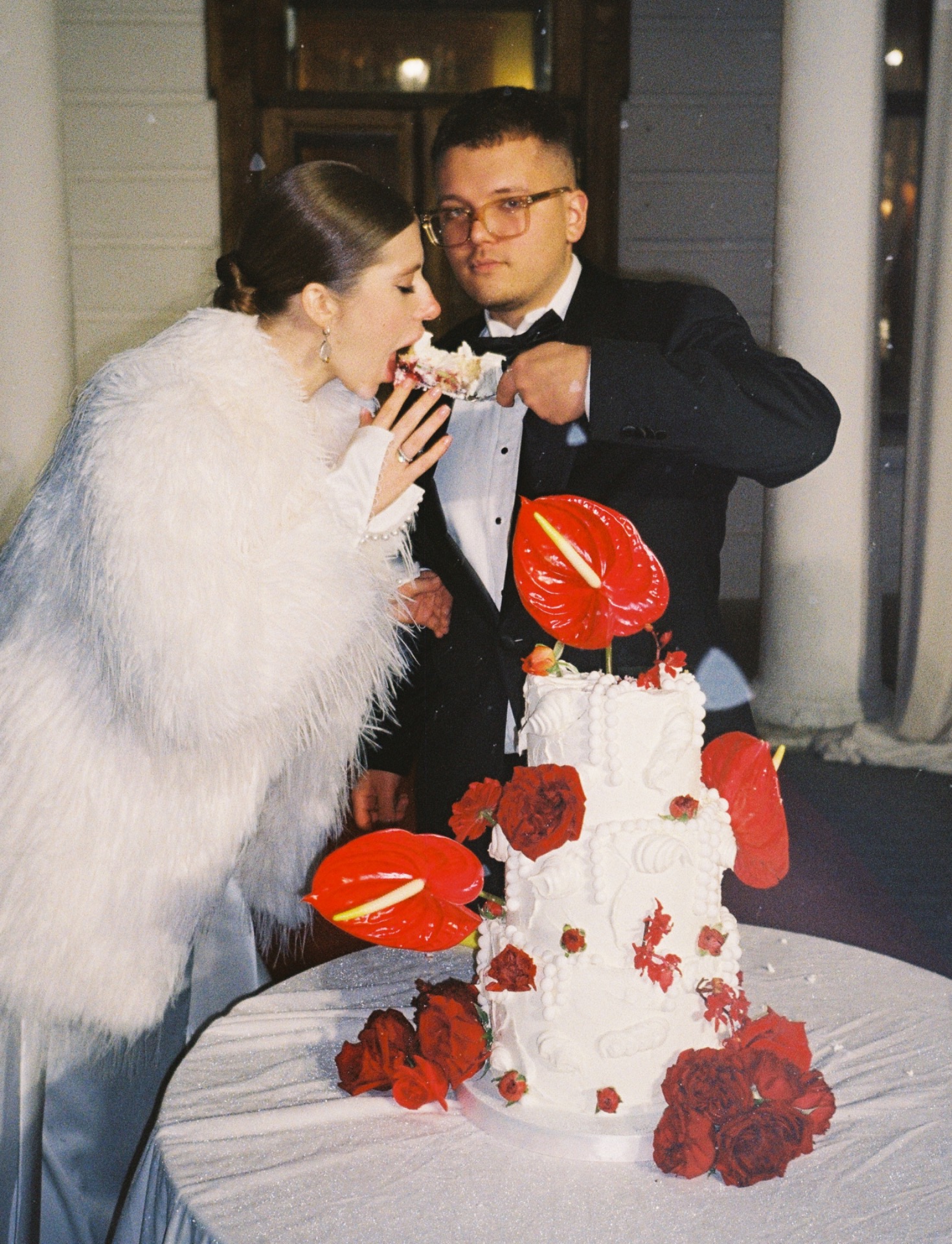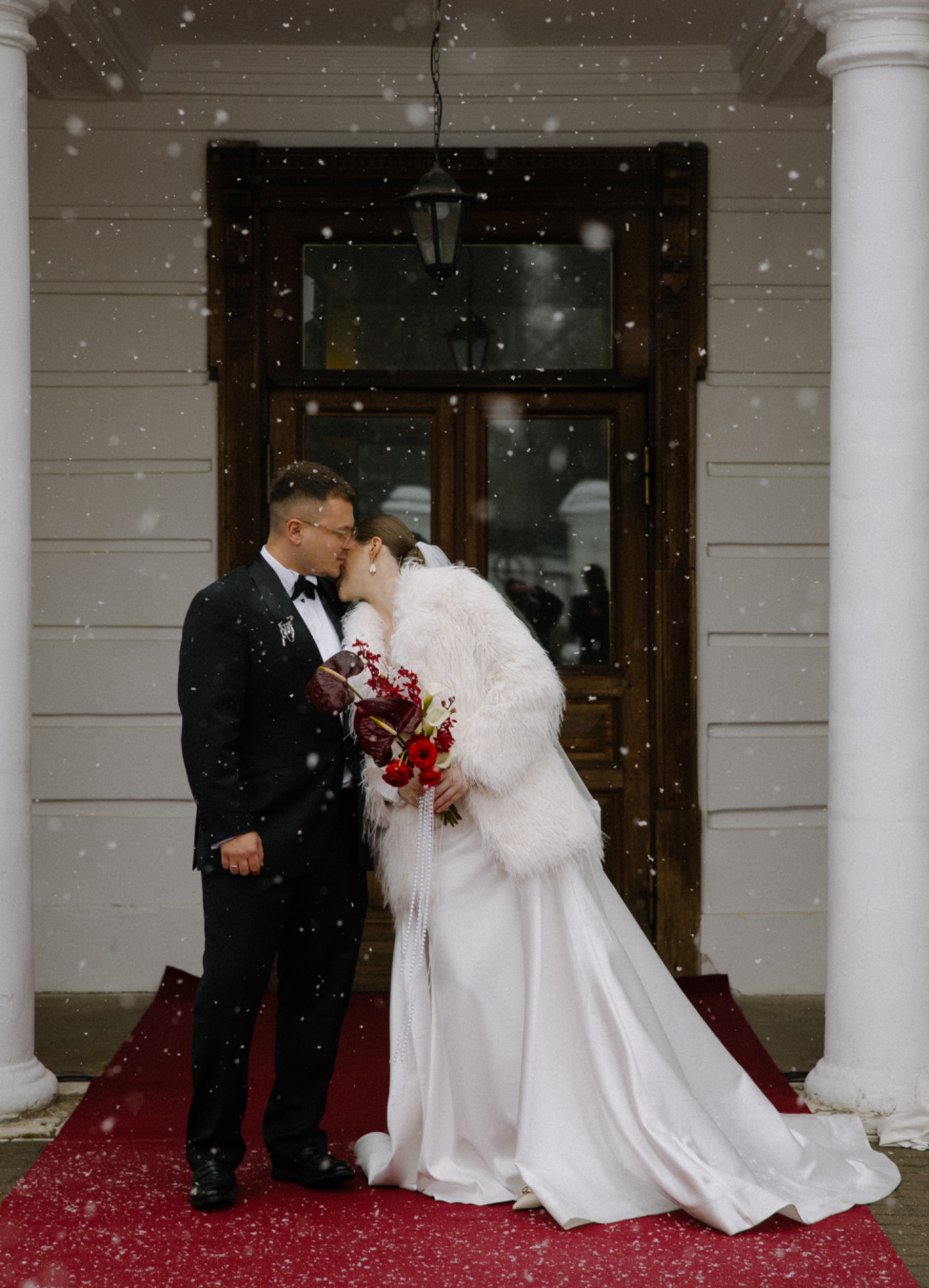 Зона церемонии стала особенно значимой. Мы ожидали тепло и солнце, но в этот день неожиданно выпал снег, хотя неделей ранее было +20°. Снежная погода только усилила магию момента: именно в момент моего выхода пошли красивые снежные хлопья. Мы обменялись трогательными клятвами и пригласили всех на банкет.
