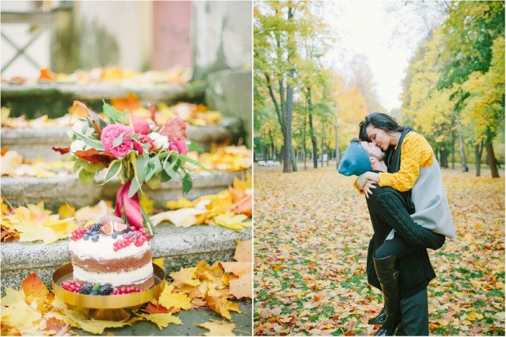 Декором для съемки послужили яркие краски на кронах деревьев. Поэтому для нас было важно не упустить момент, так как золотая осень мимолётна. Катю и Игоря мы попросили поддержать цветовую палитру и надеть уютные вязаные вещи. Также в качестве аксессуара для Кати был сделан волшебный букет с использованием перьев и бордовых листьев. И ещё мы приготовили для ребят красивый и очень вкусный сюрприз — торт.