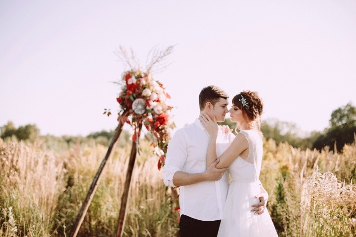 Место и время года продиктовали общую стилистику съемки. Закатное солнце, легкое струящееся платье, объятия любимого, развевающиеся пряди волос… Многие мотивы в оформлении были взяты из бохо-стиля. У нас было две зоны, органично вписанные в пространство поля: зона с вигвамом и зона ужина со столиком, на котором были сервированы вино и сезонные фрукты.
