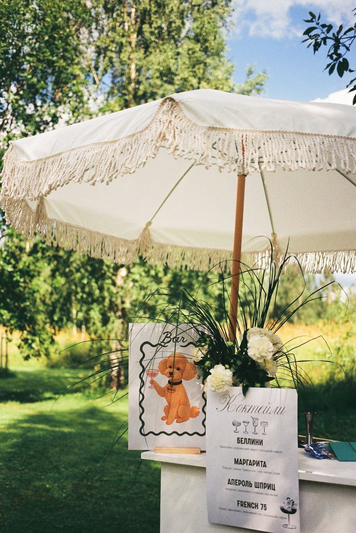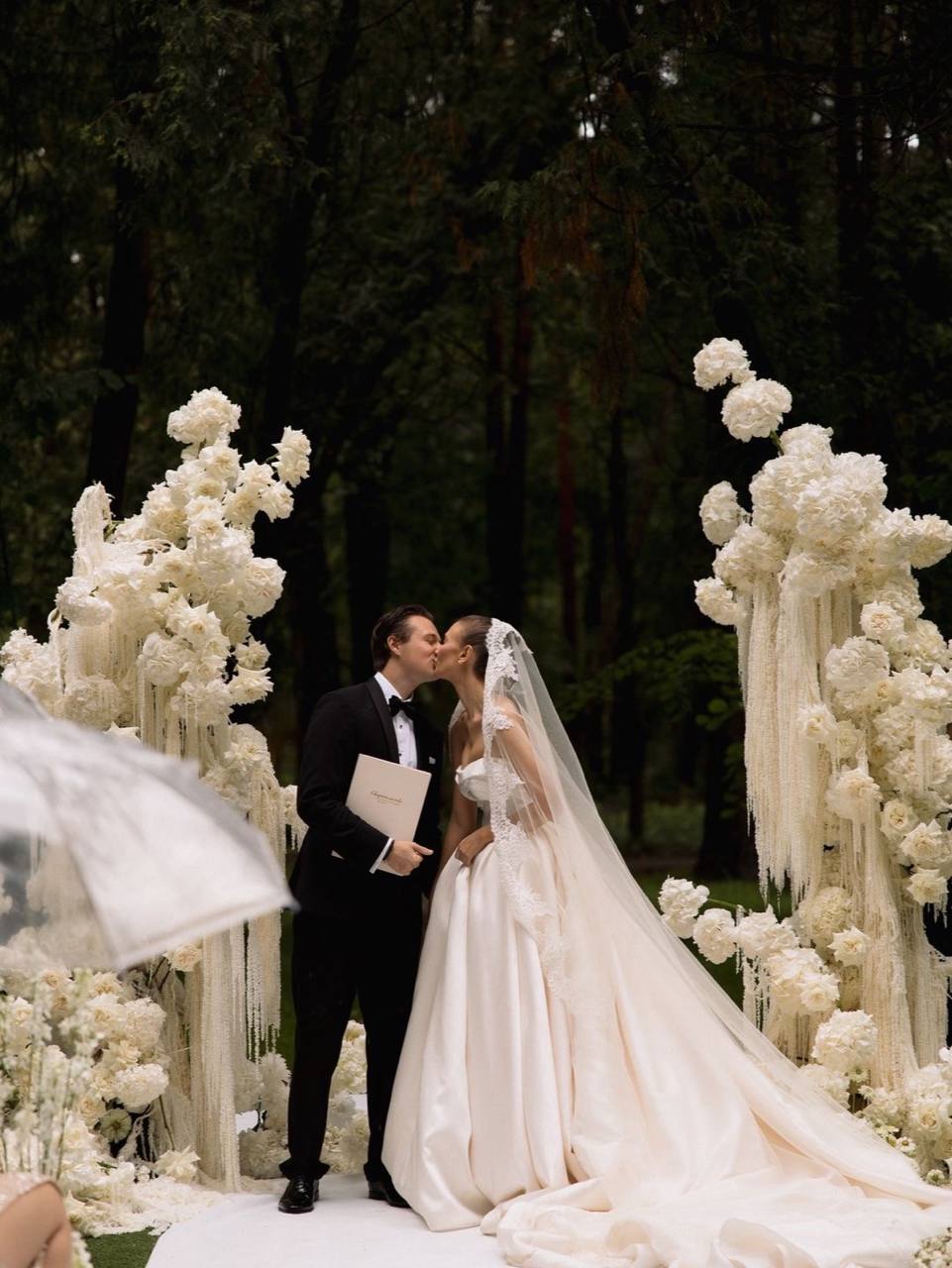 Если планируется церемония на открытом воздухе, подготовьте зонты на случай дождя. Лучше выбрать прозрачные модели или оттенки в палитре свадьбы — они гармонично впишутся в общую картину.