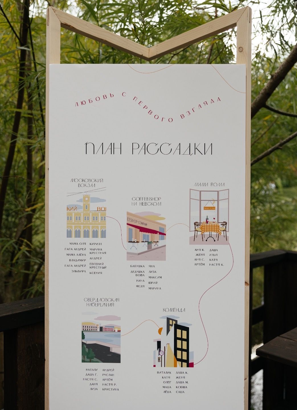 Это первое, что видят гости, приходя на праздник. Эта зона необходима для того, чтобы гости не скучали в ожидании начала торжества. Разместите здесь схему рассадки и приветственную табличку. Лучше подготовить и приветственный фуршет.