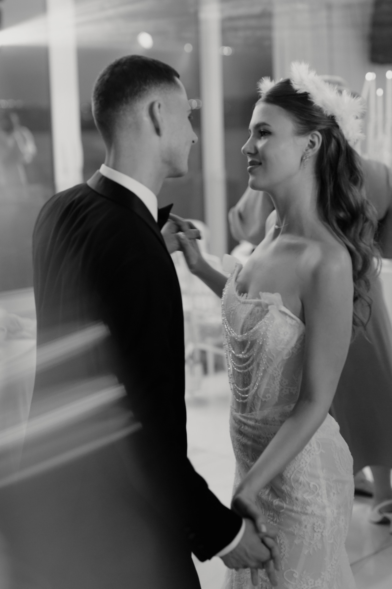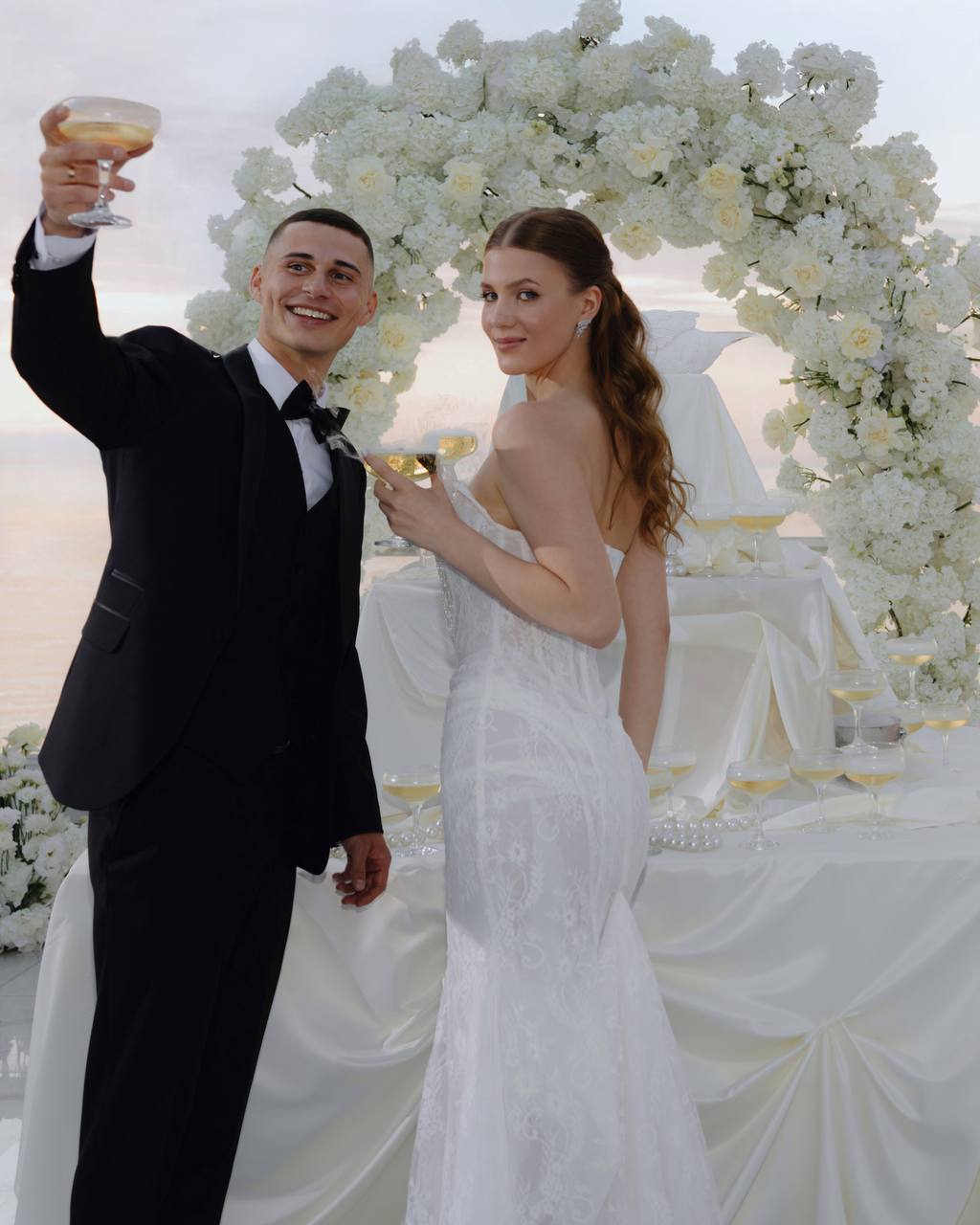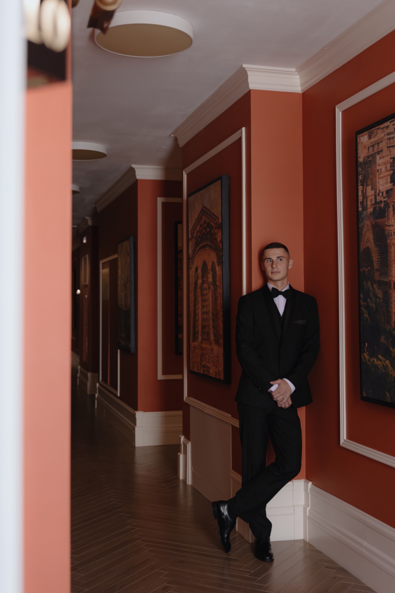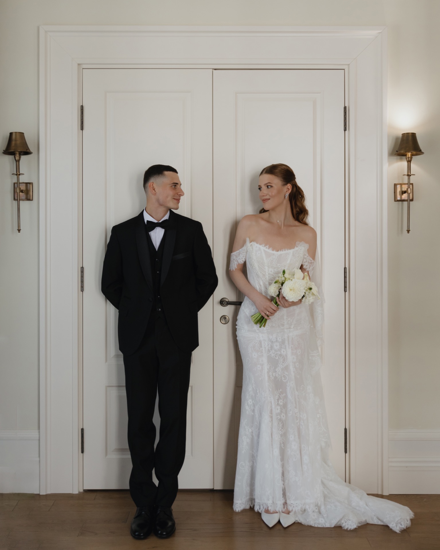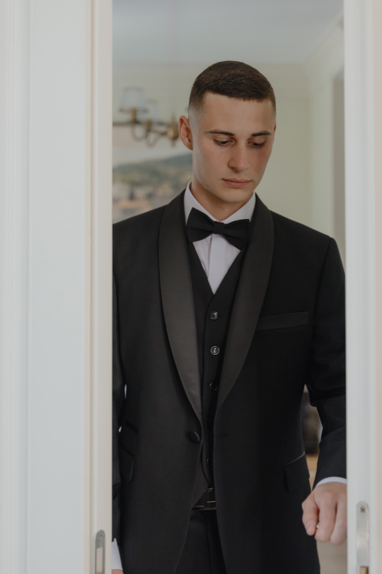 Образ Семёна был максимально классическим: чёрный смокинг с белой рубашкой, перекликающейся по цвету со свадебным платьем.