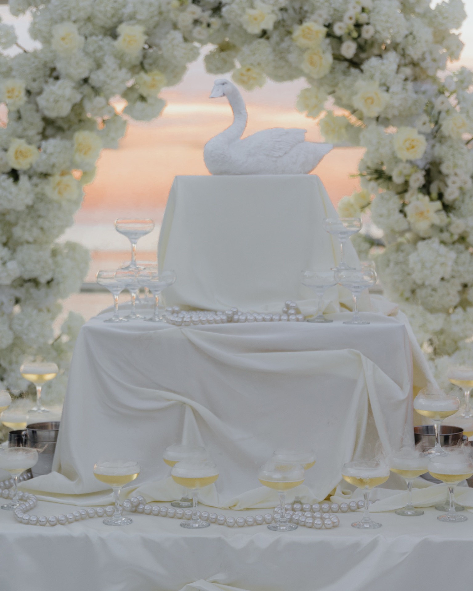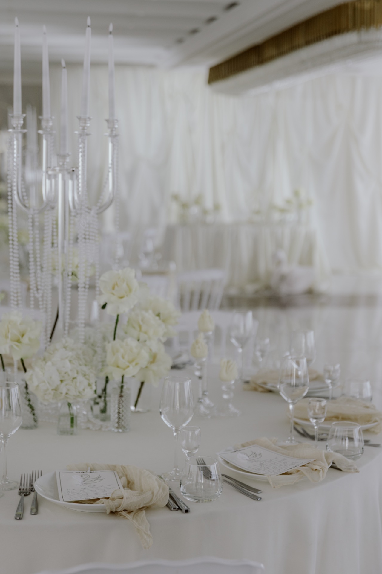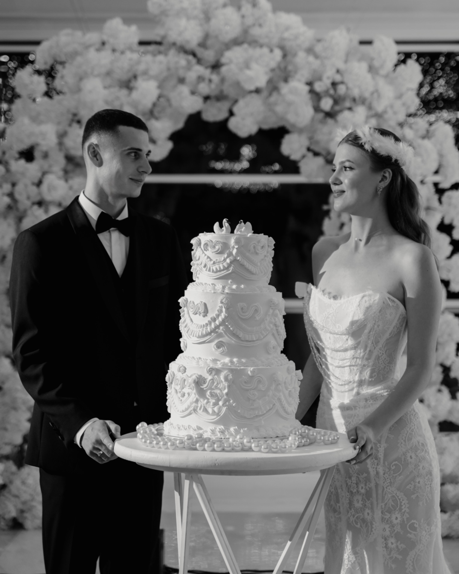 Особое место в моём сердце занимал винтажный итальянский стиль, и мы решили воплотить его через изящное кружево, мерцание свечей и хрустальные блики. Даже свадебный торт — белоснежный, с нежными рюшами и изящными лебедями — стал идеальным завершением этой концепции.