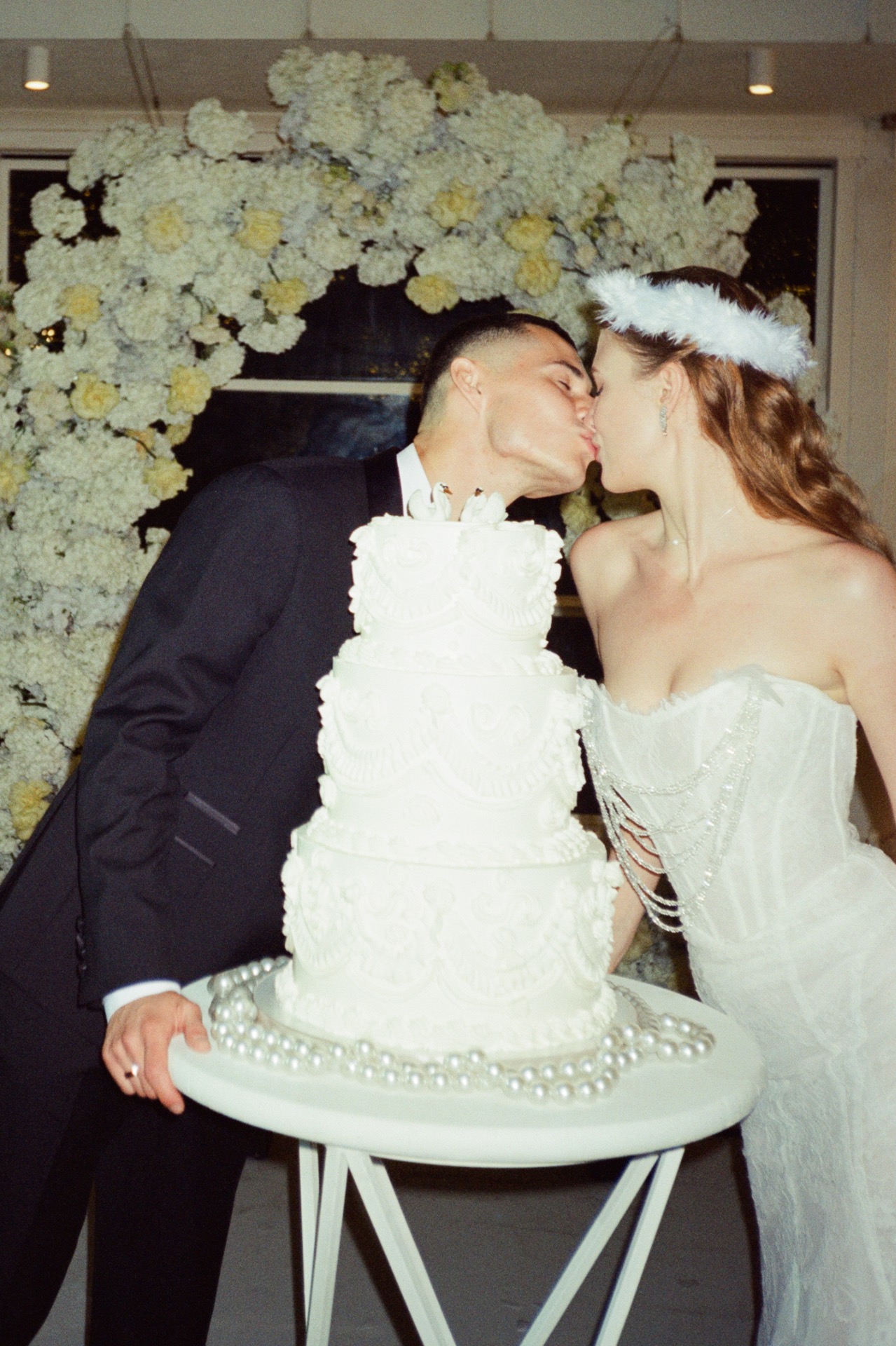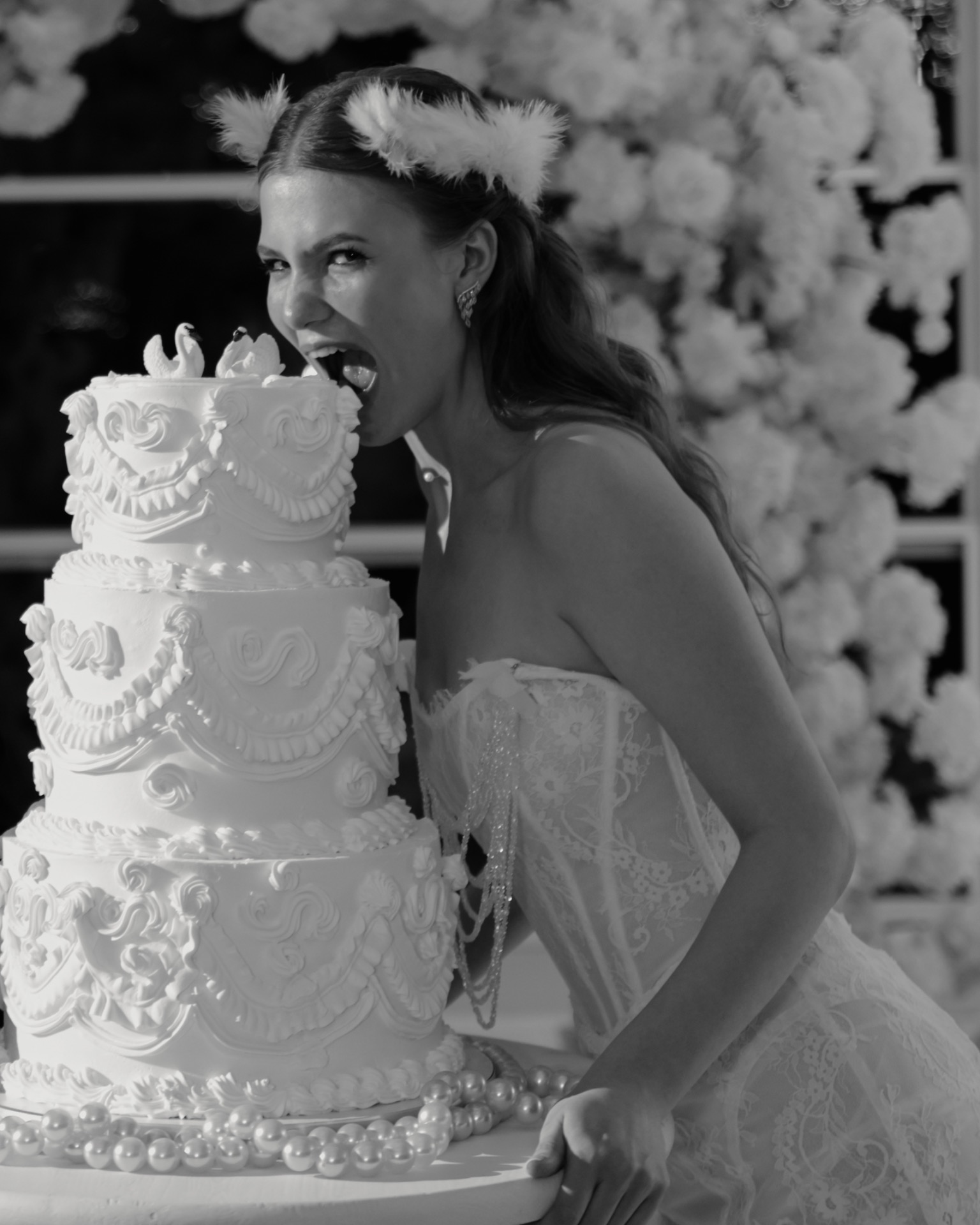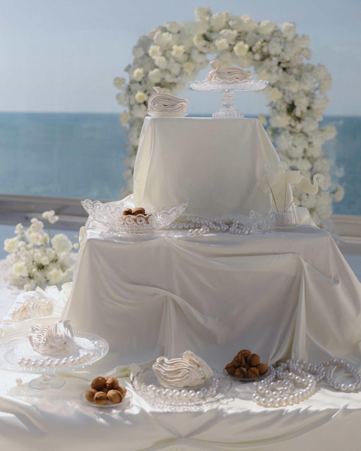 Особое место в моём сердце занимал винтажный итальянский стиль, и мы решили воплотить его через изящное кружево, мерцание свечей и хрустальные блики. Даже свадебный торт — белоснежный, с нежными рюшами и изящными лебедями — стал идеальным завершением этой концепции.